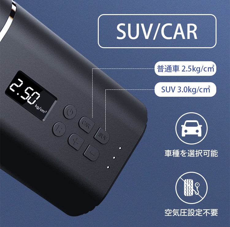 「Boost Air」には「CAR」というボタンと「SUV」という2種類のボタンがついています。このボタンを押せば、細かい設定が不要で自動で空気が入るので、タイヤの空気圧に詳しくない初心者の方でも安心です。普通車には「CAR」を押して頂くと2.5barの空気が入り、SUV車には「SUV」を押して頂くと3.0barの空気が入り、自動で止まる設定になっています。