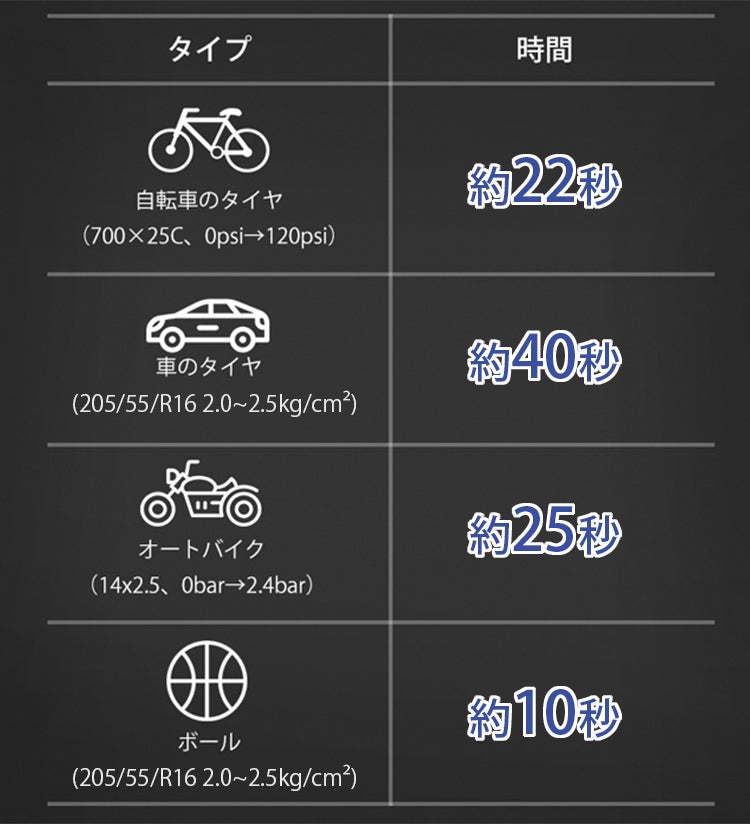 車のタイヤ空気圧が2.0bar以下になった場合、空気を入れる必要があります。そこで「Boost Air」は短時間で大きな圧力をかけられるので、205/55/R16サイズなら2.0kg/㎠から2.5kg/㎠までの空気が約40秒で満タンに。野外や緊急時にも活躍してくれます。