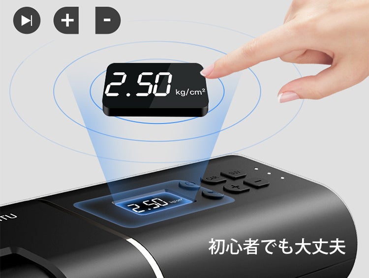 季節によって最適な空気圧を変えたり、自分の好きな設定があるという方にも「Boost Air」は手動で0.5kg/㎠ごとの細かい設定することが可能です。±のボタンを押すだけで、対象のものに合わせてお好みの値に調節してお使い頂くことができます。