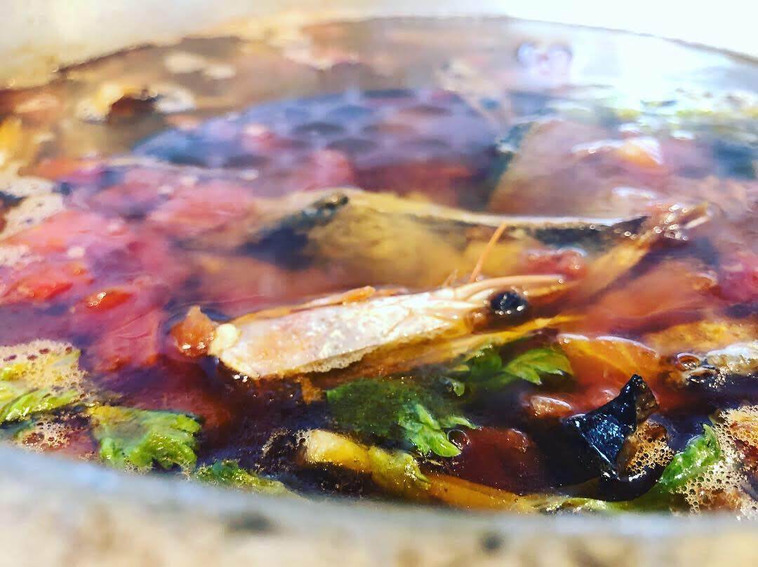 ↑本来、捨ててしまうはずの海老の頭、魚の骨やアラをオーブンで数時間かけてカラカラに焼き、香味野菜と煮詰め魚介出汁を作ります。この出汁は魚進のパスタソース、お惣菜の味の素になっています。
