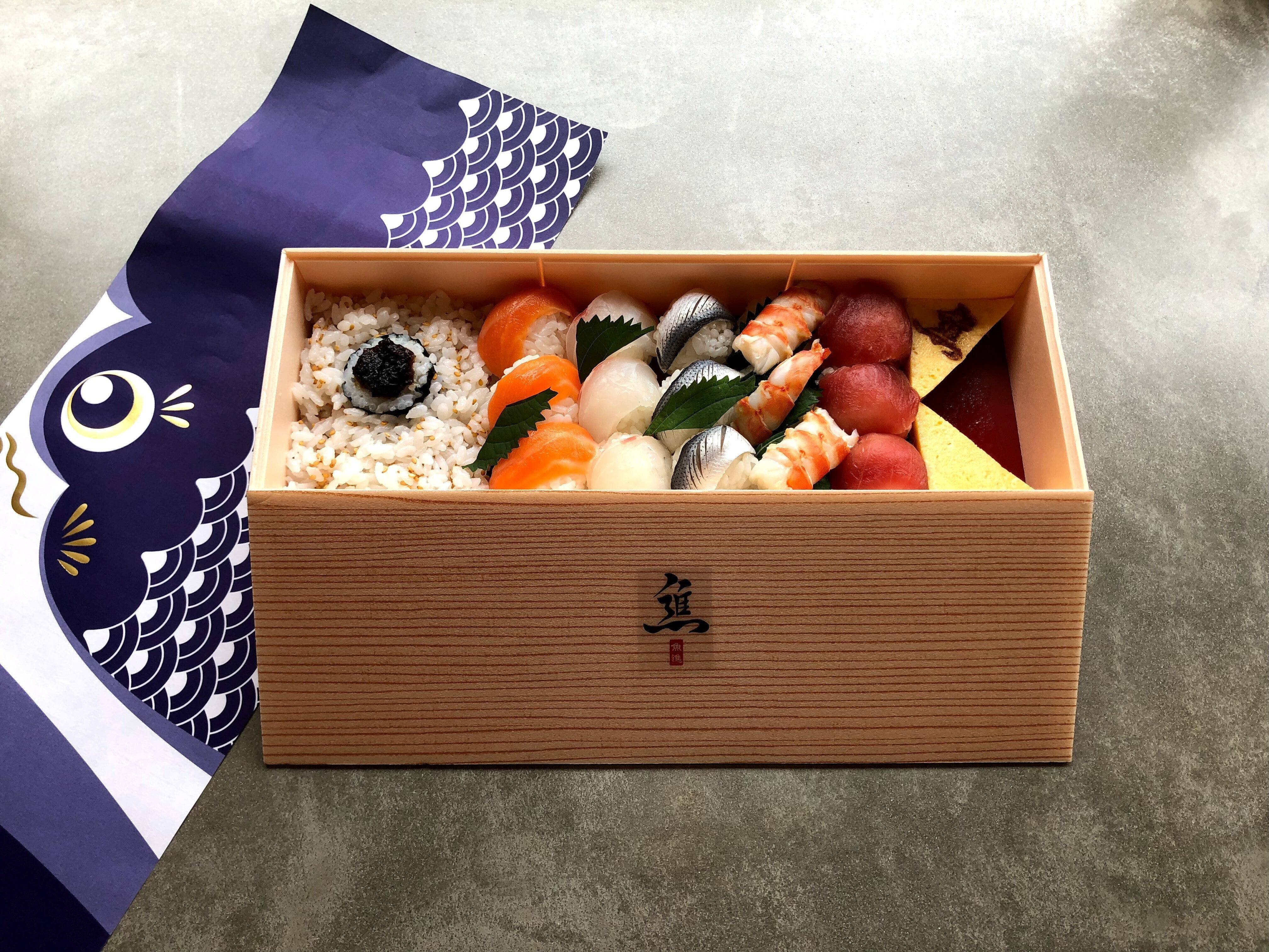 ↑加須ブランドに認定された「鯉のぼり手まり寿司」。加須市の名産品である「こいのぼり」をモチーフにし、鱗を手まり寿司で再現しました。
