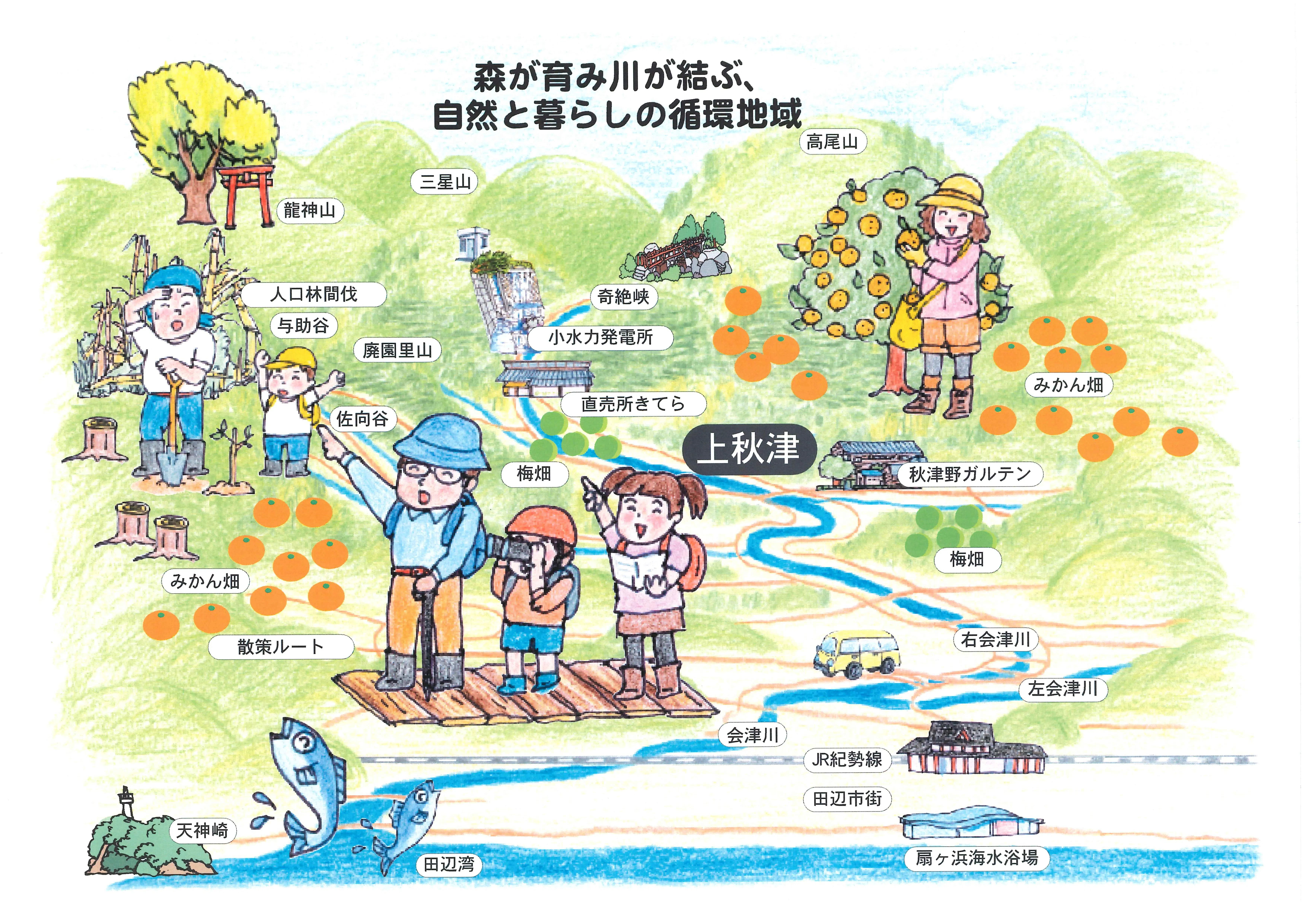 上秋津地域は田辺市郊外に位置し、中心市街地から車で15分、3方を山に囲まれた中山間地に属する果樹農業が盛んな農村であり、地域づくりの町として全国的にも有名です。