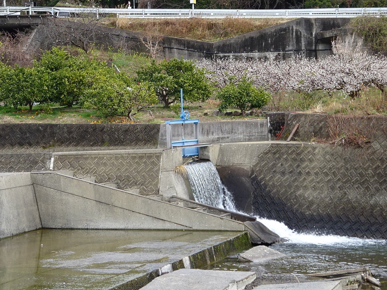 農村には地域を毛細血管のように張り巡らされた農業用の用水があります。地域の中心を会津川が流れ、この川から取水口を通って用水へと水が送られています。 平地の少ない当地区では、一枚当たりの水田は狭かったことで、政府の減反政策で水をあまり必要としない果樹作(梅や柑橘)への転換がすすんだ結果、取水口の門から多くの水が川へと返される結果となっています。
