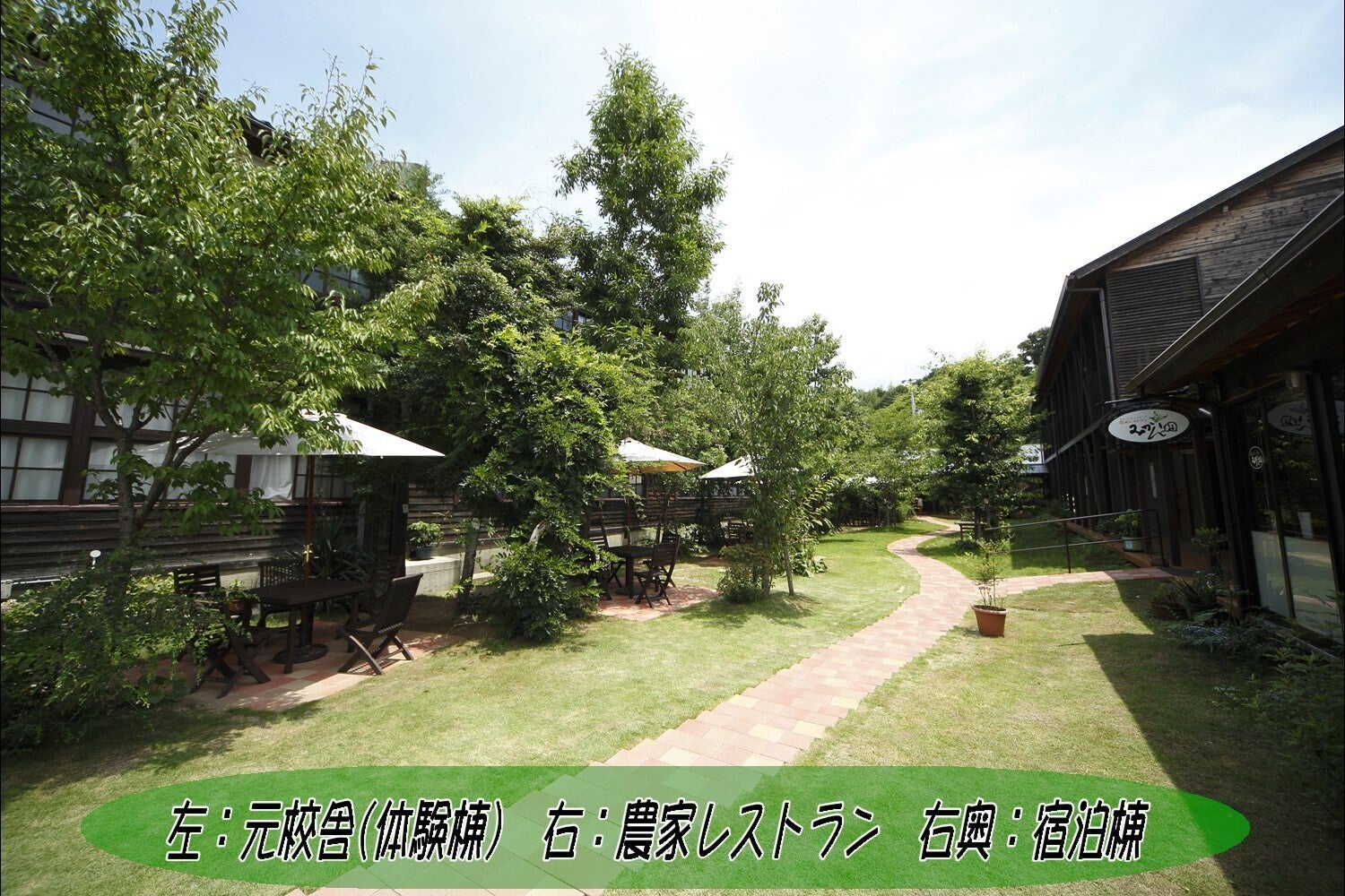 (左:木造校舎、右:農家レストラン、右奥:宿泊棟)