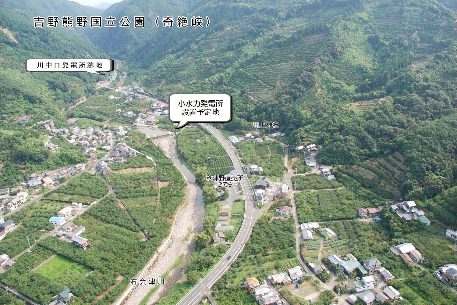 秋津野水力発電復活プロジェクトは、吉野熊野国立公園奇絶峡(きぜっきょう)から流れ来る水で小水力発電を行い得られた収益で地域づくりを応援しようというプロジェクトです。