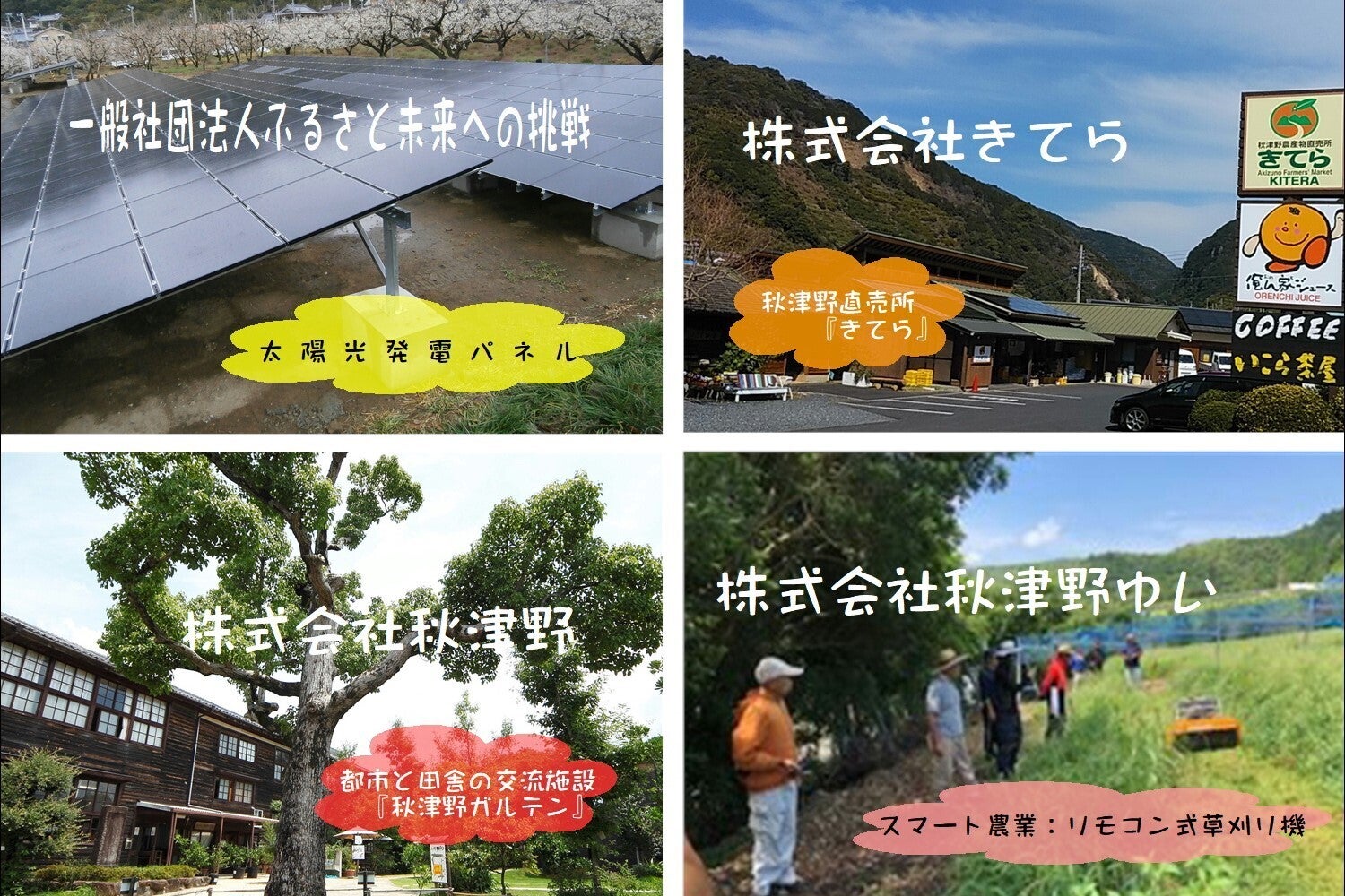 平成11年は農産物直売所を、平成19年には都市農村交流施設をコミュニティビジネスで立ち上げ、地域活性化に大きな役割を果たしてきました。さらに地域づくりを行う人材を育成するため、和歌山大学と連携をし、平成20年から秋津野ガルテンや地域フィールドを活用し「地域づくり学校」の運営も行っています。 しかしながらコミュニティービジネスでは黒字を出し運営を続けるのは大変な努力が必要であります。そして地域づくりに携わる人材育成には時間も費用もかかりますが、地域にとっては絶対必要です。