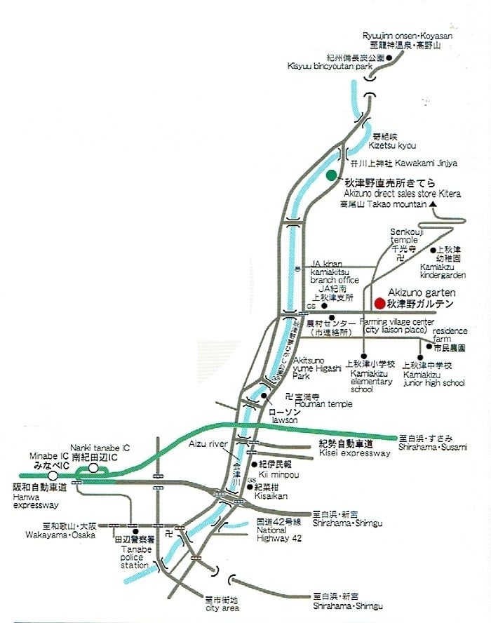 平成20年に元小学校の跡地をリノベーションしオープンした、 都市と農村の交流施設「秋津野ガルテン」にある 農家レストラン『農家レストランみかん畑』は、地元の新鮮食材を利用し、農村のお母さんたち(プロの主婦が作る)が手づくりする料理が非常に人気です。気候の良い季節では手入れの行き届いた校庭でのお食事が人気を呼んでいます。