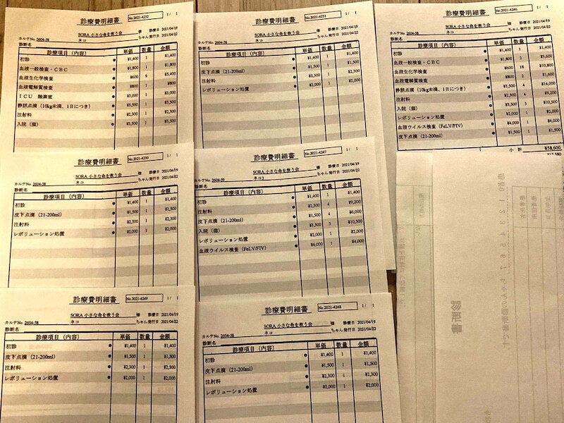 ここまでかかった医療費やレスキュー時に用意していった容器やシリンジ、猫フード等は全て当会で負担いたしました。当会でお預かりしている皆様からのご寄付金の中から大切に使わせていただきました。