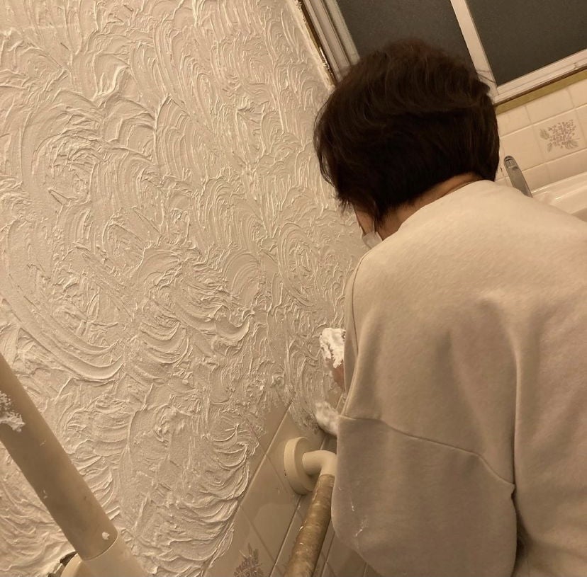 ハケを使わず手で塗って、漆喰模様をつけていきます。なかなか難しいですが楽しいです。
