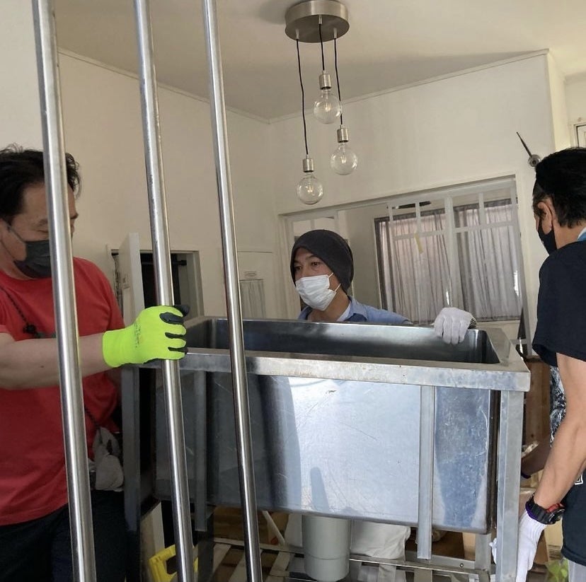 ケア施設に運び入れるわんちゃん用バスタブも男性スタッフが力を合わせてくれたおかげで、なんとか運び込めました。