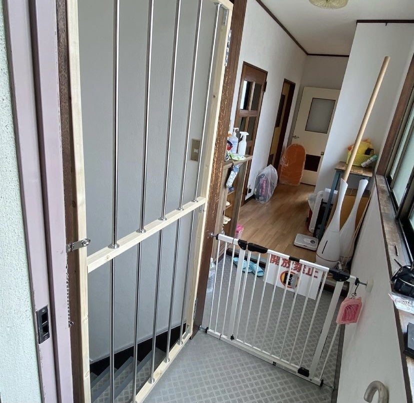 2階の階段の降り口が危なく感じましたので、リフォーム業者さんに改めて見積もりをお願いし、造作でオリジナルの扉を作っていただき、転落防止も含め格子扉をつけてもらいました。