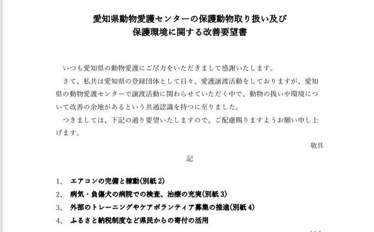 愛知県動物愛護センターの保護動物取り扱い及び保護環境に関する改善要望書を提出いたしました。