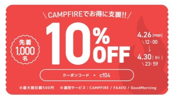 CAMPFIREより4月26日(月)〜4月30日(金)の5日間限定で、CAMPFIREで使える10%OFFクーポンを発行されました。
