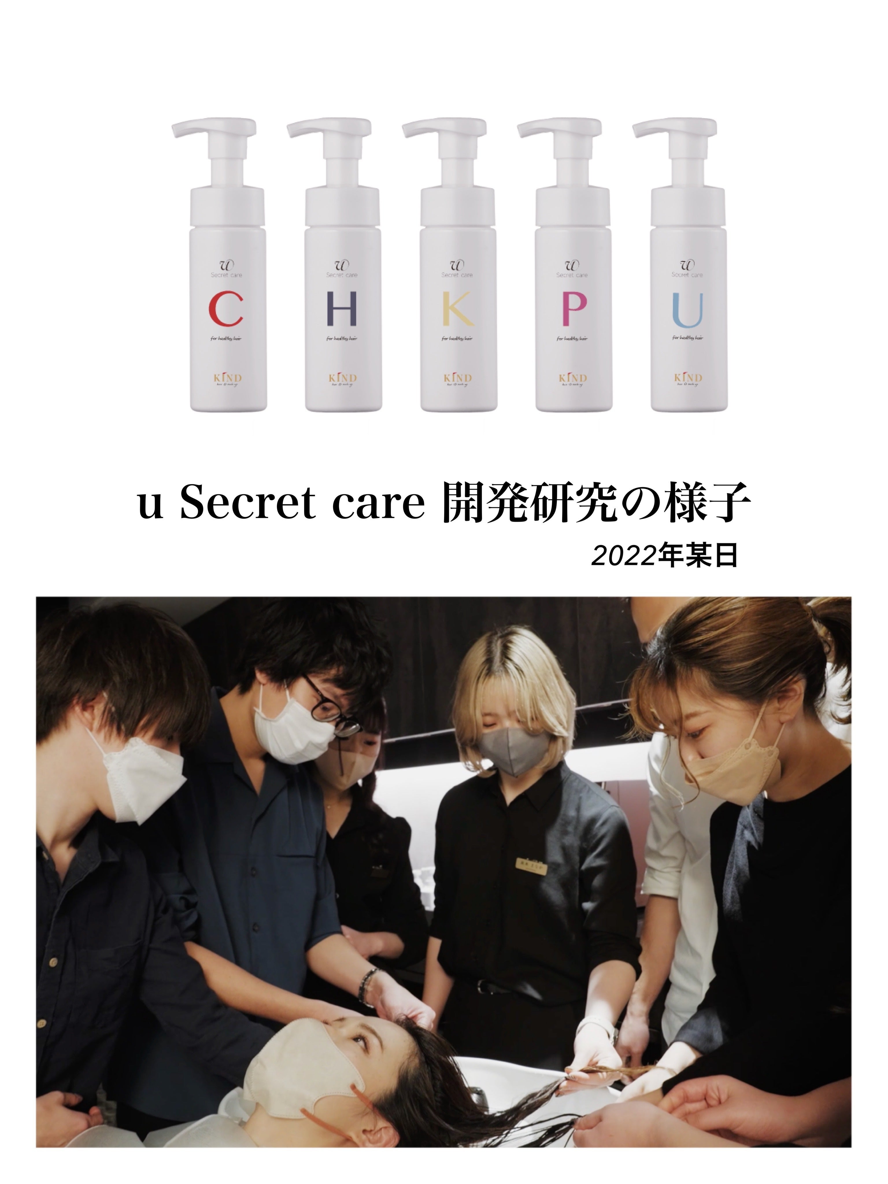 ★開発研究の様子★(2022年某日)写真:試作の匂いや、髪の毛の質感の変化など、使用感をチェックしています。私たちKINDスタッフは、ヘアケアにおける科学理論をとことん学び、薬剤一つひとつが、様々な髪質にどのように影響し、髪の中で何が起こっているかを考え、理解します。商品は、ヘアダメージに悩むお客様がご自宅でも使いやすいものを。テストと試作を重ねて 『u secret care』は、誕生しました。数多の髪を触ってきた美容師が生み出した『u secret care』。一人でも多くの方の髪に寄り添いたいです。引き続き、プロジェクトの応援をよろしくお願い申し上げます。