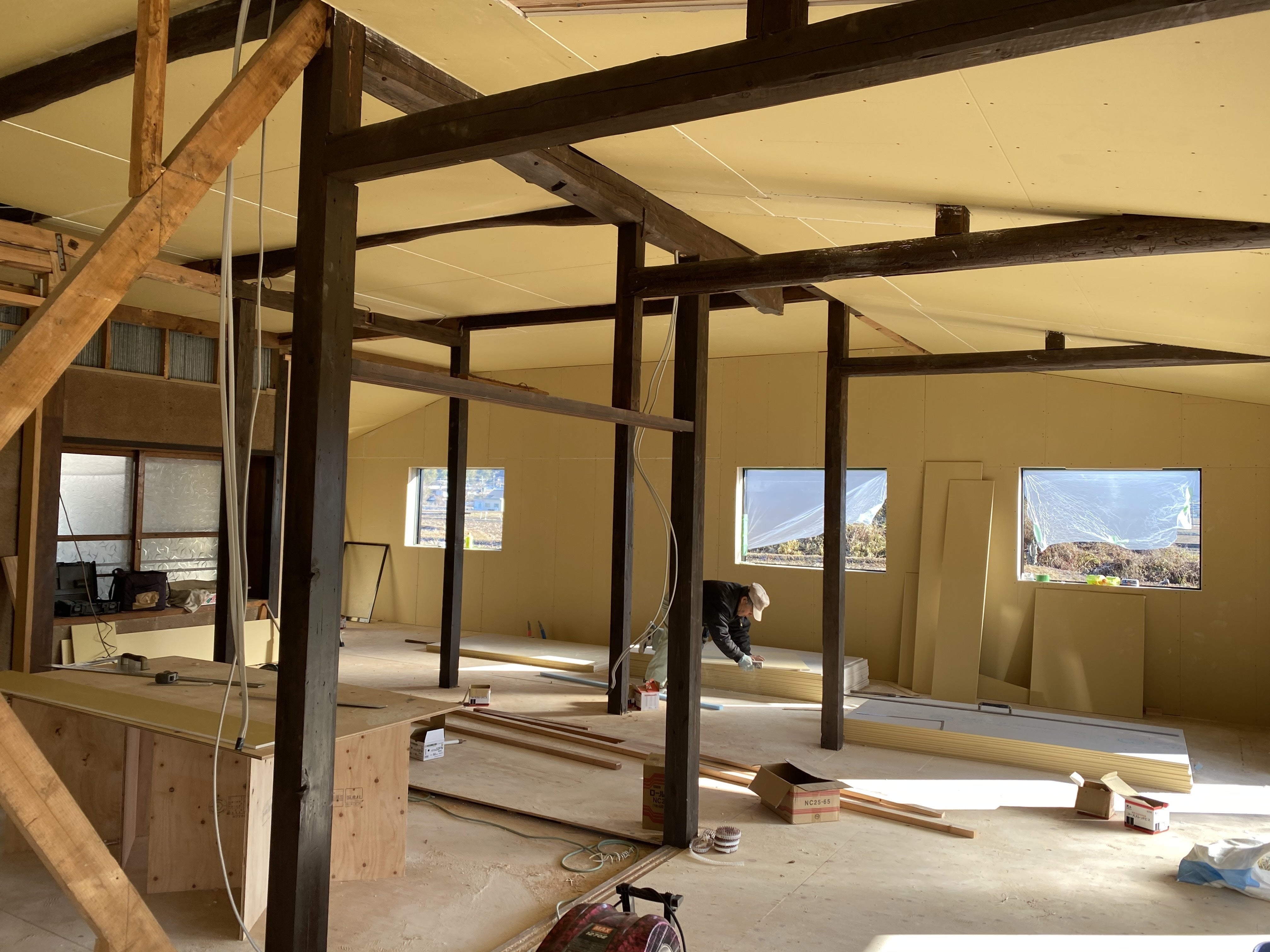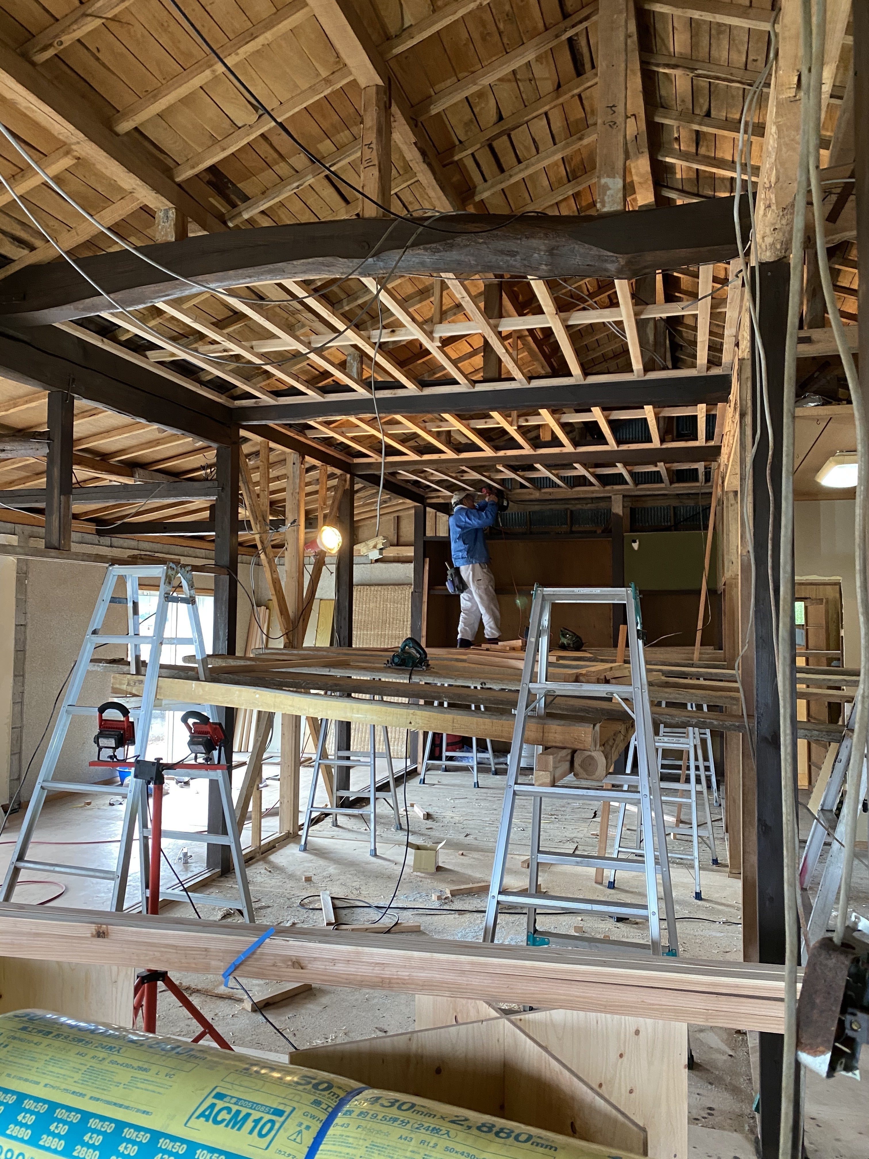 2021/03/02 10:50おはようございます、門田です☀活動報告第2弾は塗装開始・大工さん合流編です!解体がある程度終わったので防腐剤入りの塗料を完成時見える予定の梁にせっせと塗っていきます。社長もせっせと塗装中☆埃を落としやすりをかけ、私たちは埃まみれの木屑だらけ(笑)加えて高所恐怖症のわたしはブルブルしながら脚立に上りめいっぱい手を伸ばして真上を塗るしかなかったため、、こうなりました、、この後連日こうなりました(笑)油性塗料なので絶望しましたがお化粧と一緒に落とせました( ;∀;) !ちなみに現時点で工事期間の約2か月により3段脚立の一番上に!なんと!!立てるようになりました°˖✧◝(⁰▿⁰)◜✧˖°(足はブルブル)床に断熱材を入れていきますそして地元の大工さんも合流して床、壁を作っていきました。これも大工さんの指示を仰ぎながらスタッフもせっせと作業、、、筋肉痛の日々に終わりが来ません。スタッフの体の平穏はいつ訪れるのか、、次に続きます、、、 もっと見る