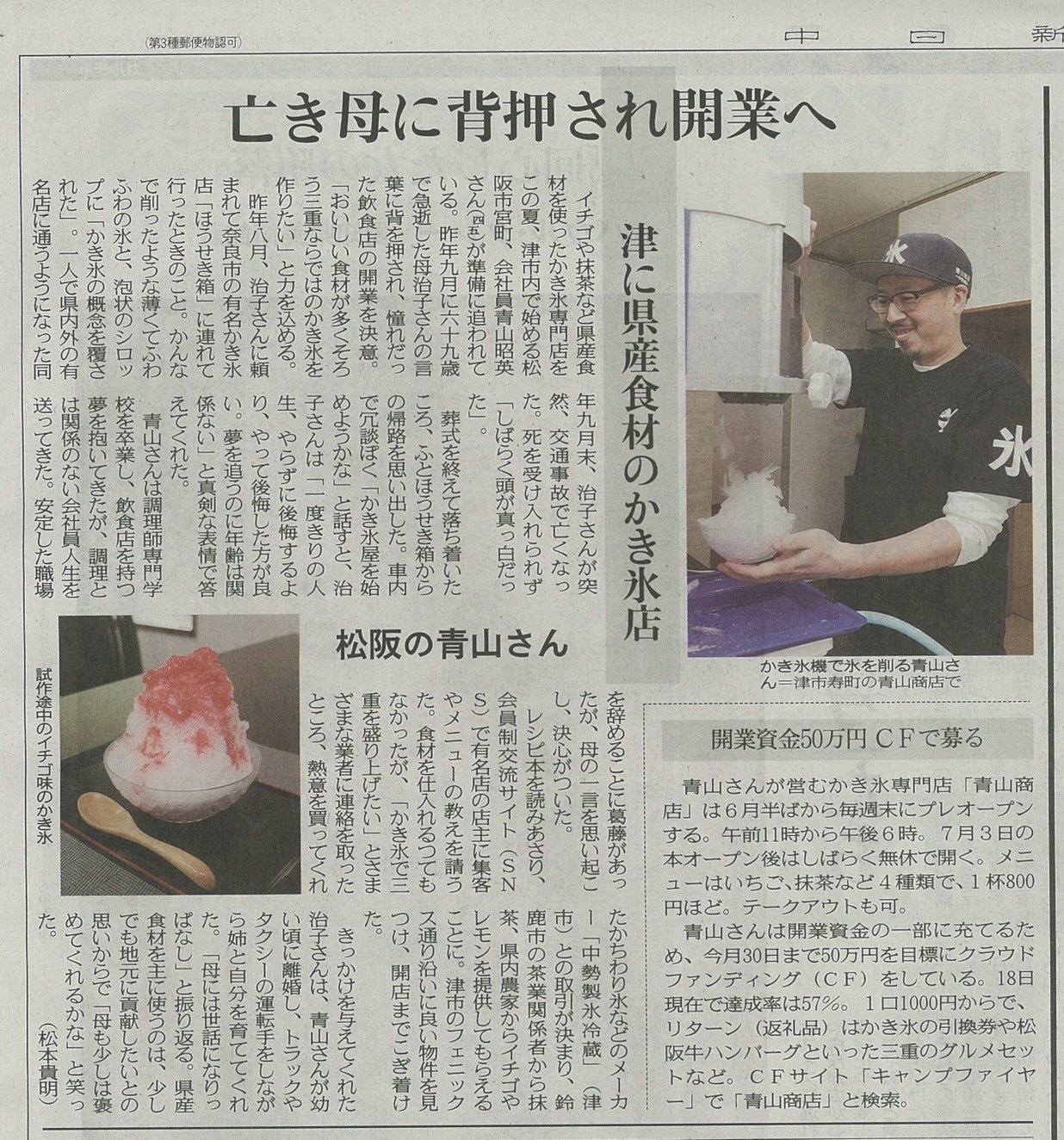 お世話になります。青山商店の青山です。6月の週末で予定しておりましたプレオープンですが誠に勝ってながら、中止とさせて頂く事になりました。この場をお借りして深くお詫び申し上げます。理由としては、6月より保健所の法改定に伴い、厨房の改善工事が必要となった為、本当に申し訳ありません7月3日のオープン日には皆様を笑顔に出来る様なかき氷を提供出来ます様、オープン日までにもかき氷のメニュー開発に取り組んで行く所存です長く愛され続ける様な場を、皆様と一緒に作っていけるよう、全力を尽くして参りますので、引き続き、応援の程、どうぞ宜しくお願い致します話が飛躍しますがありがたい事に本日の朝日新聞三重県版様にも当店の記事を掲載して頂けました。沢山の方々に支えて頂き本当に心より感謝申し上げます。