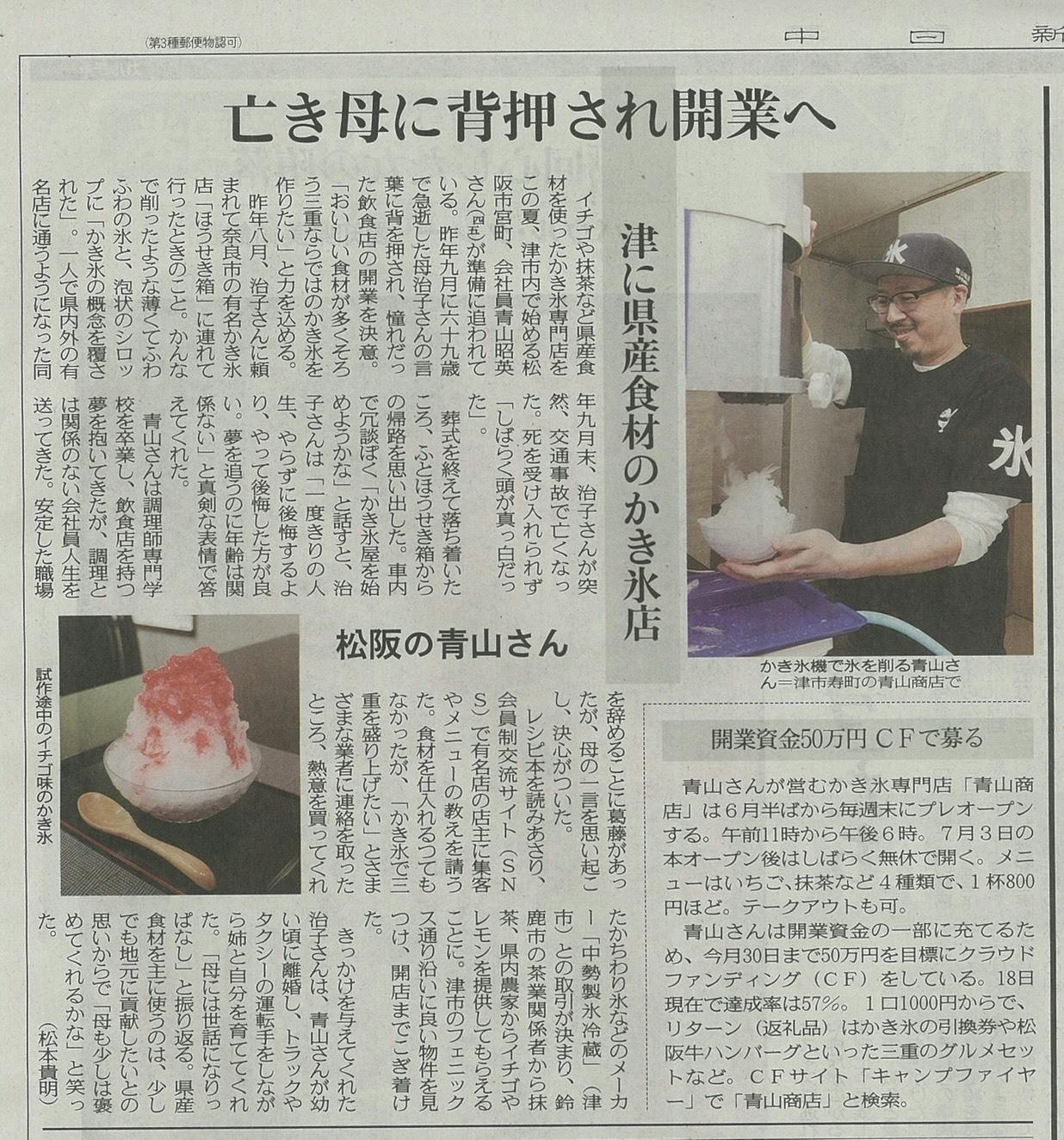 本日の中日新聞三重版の朝刊に先日取材して頂いた記事を掲載して頂けました。