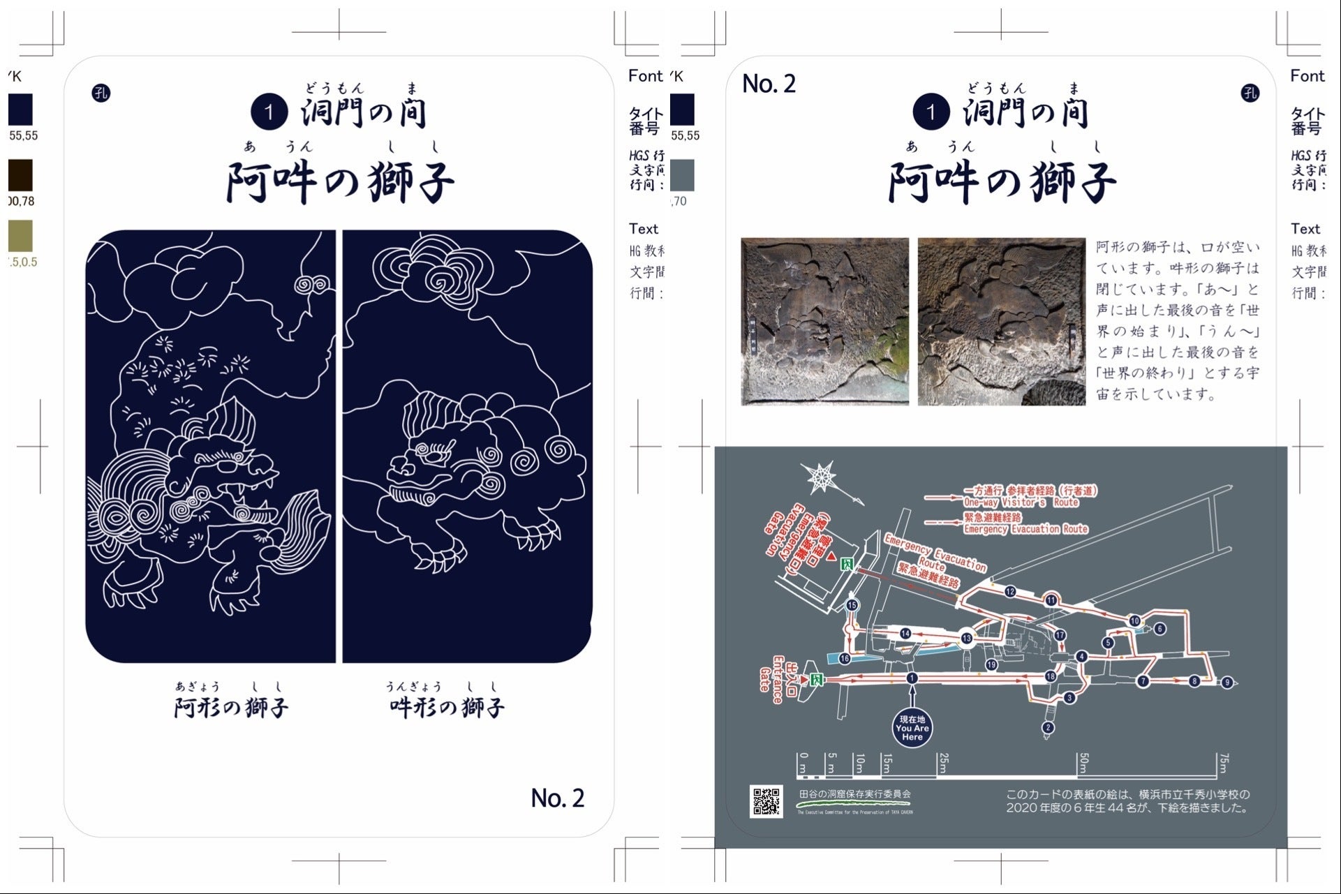 ③ 児童たちの版画をデジタル化してグラフィック処理を施し、洞内イラストガイドカード化。