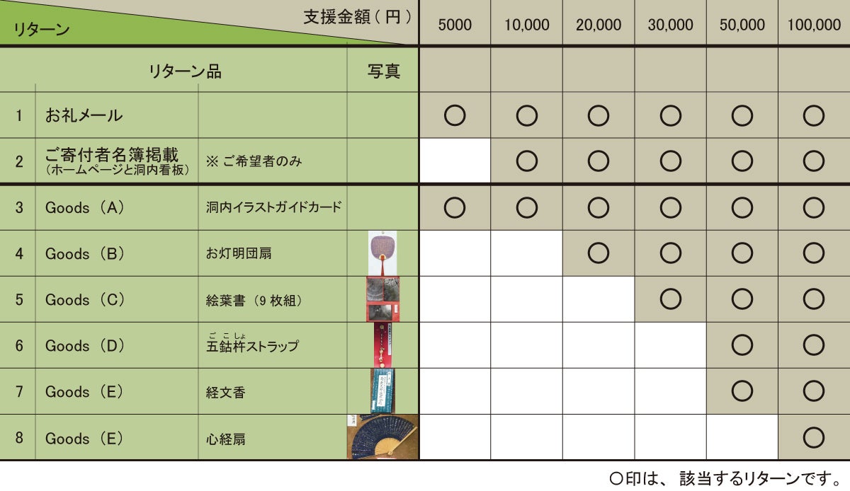 ご支援額に対するリターン対応表