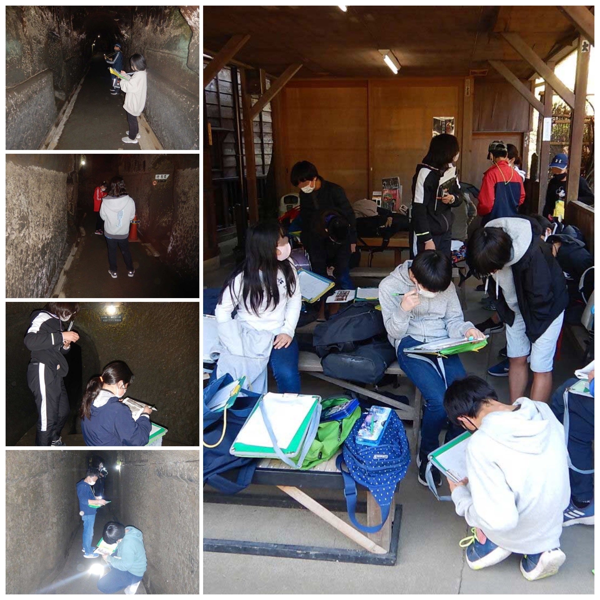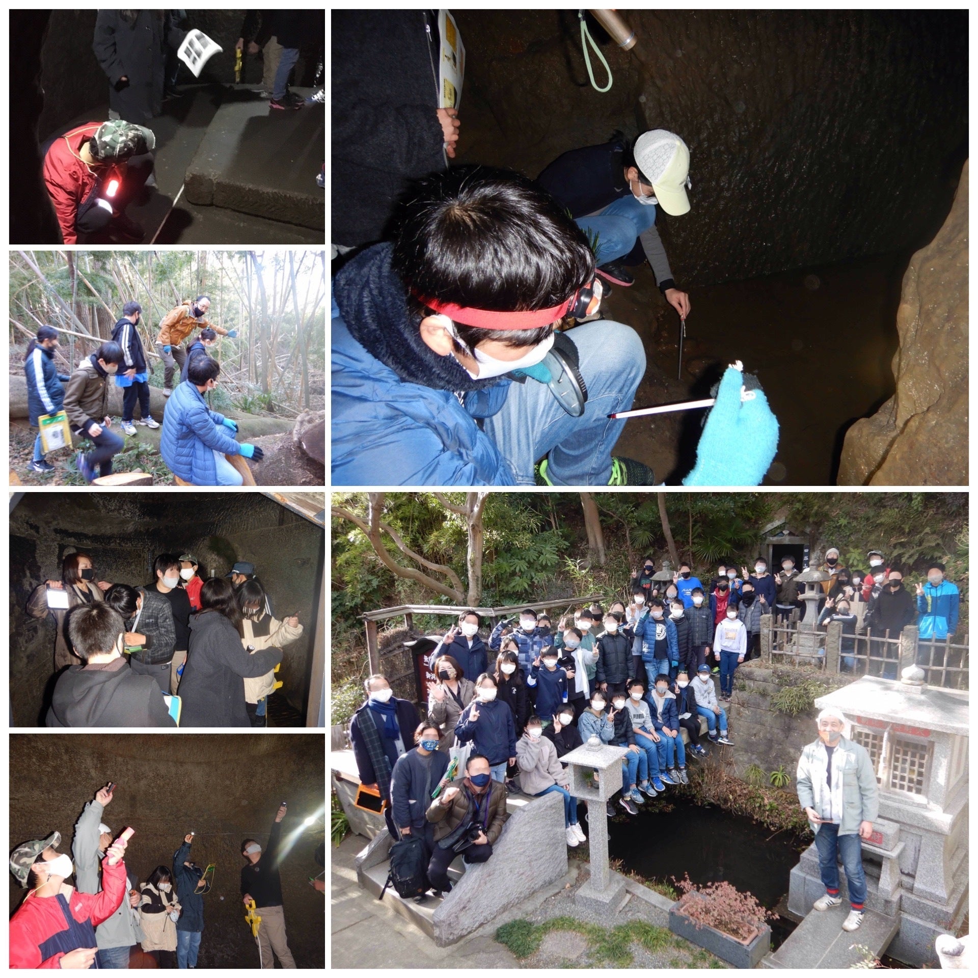 田谷の洞窟内の部屋の大きさの測量や、温湿度の観測を行い、洞窟環境の観察をして、洞窟の上の里山にも登り、里山環境の実態や、近隣で進行している高速道路のインターチェンジの工事による環境変化を観察する授業を行いました。