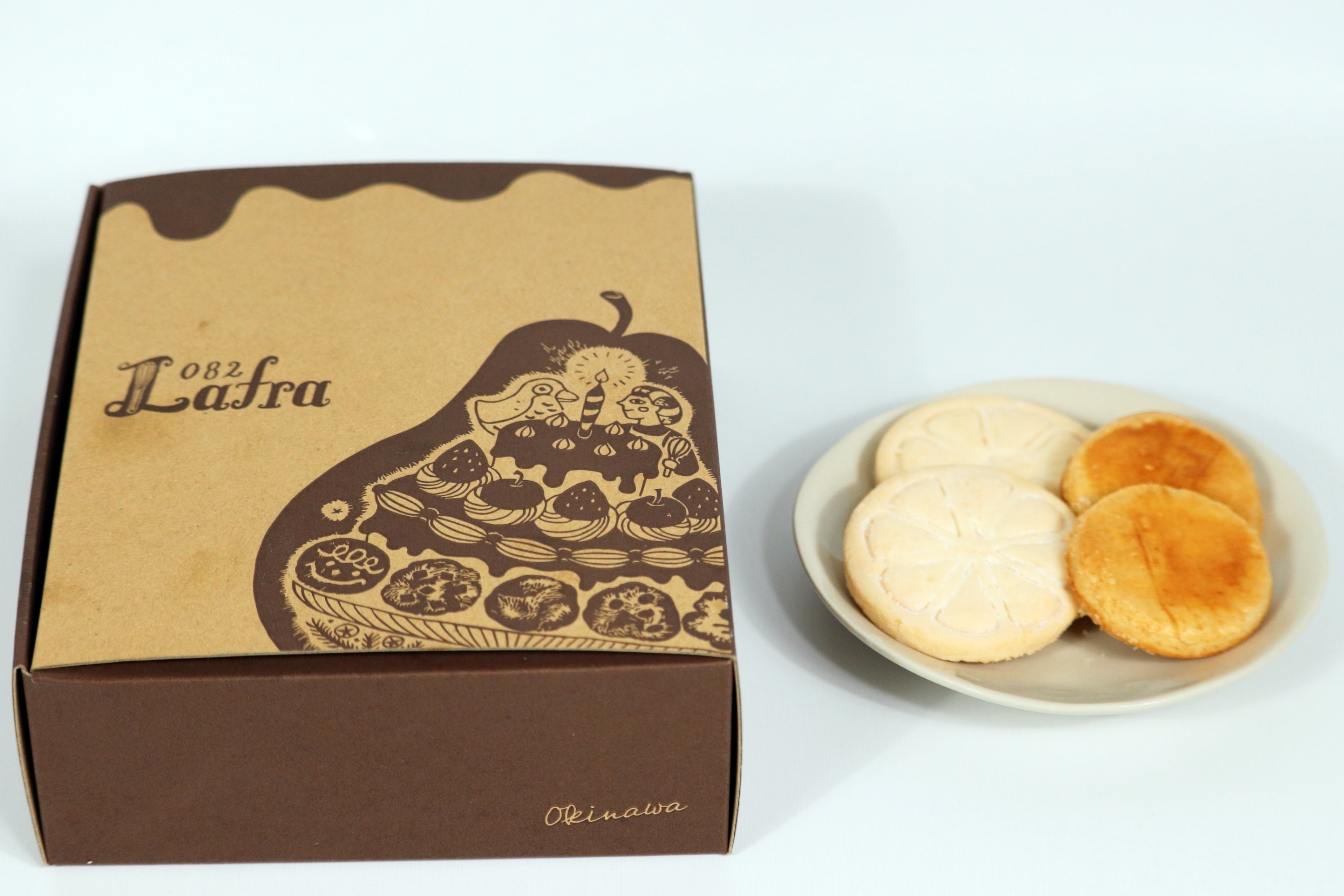 うるま市のお菓子屋さん・Lafraさんの製作のもと、シークヮサーちんすこうと浜比嘉塩のガレットが一箱にそれぞれ5枚ずつ、計10枚入っています。