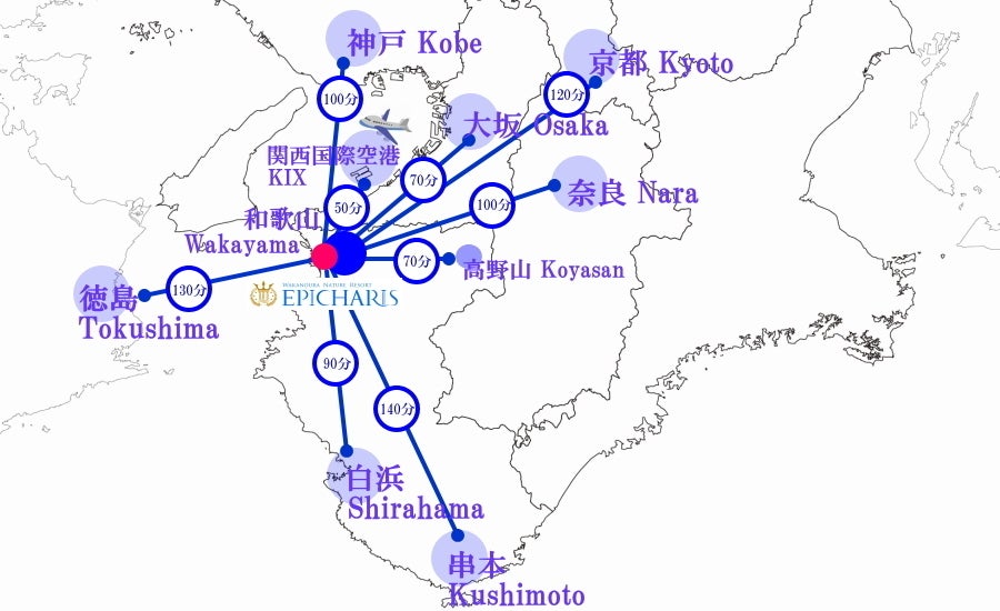 - ●・JR線新大阪駅から特急くろしお1時間でJR和歌山駅。JR和歌山駅よりタクシー約20分、又はバス2番のりば24系統、新和歌浦行き乗車、新和歌浦バス亭下車、徒歩5分。