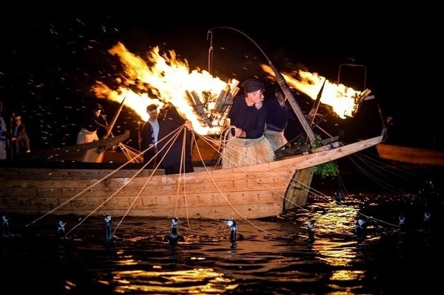 漆黒の闇の中、赤々と燃える篝火を川面に映し、鵜匠と鵜が一体となって繰り広げる古典漁法「鵜飼」は、現在を忘れ千古の昔にタイムスリップしたような幽玄の世界へと誘います。