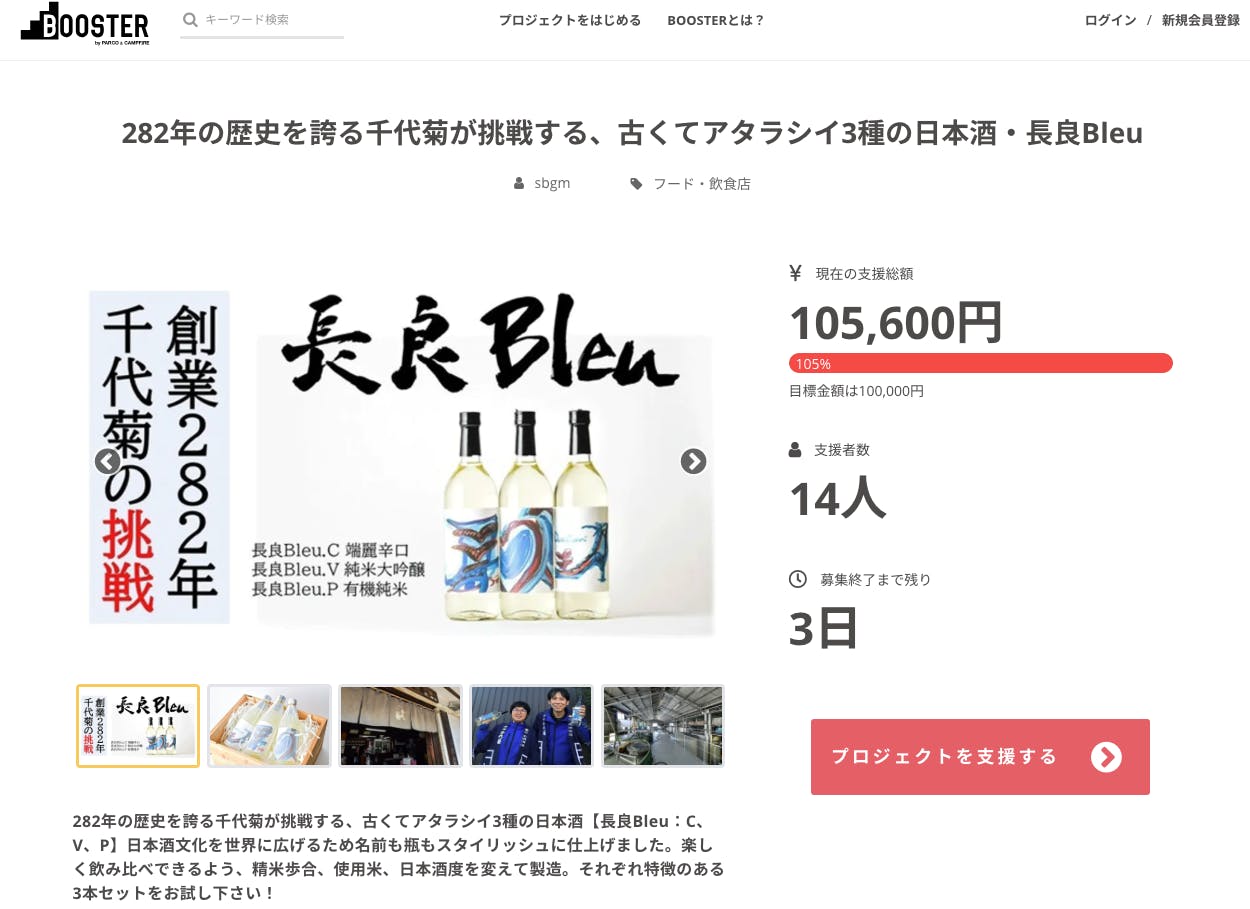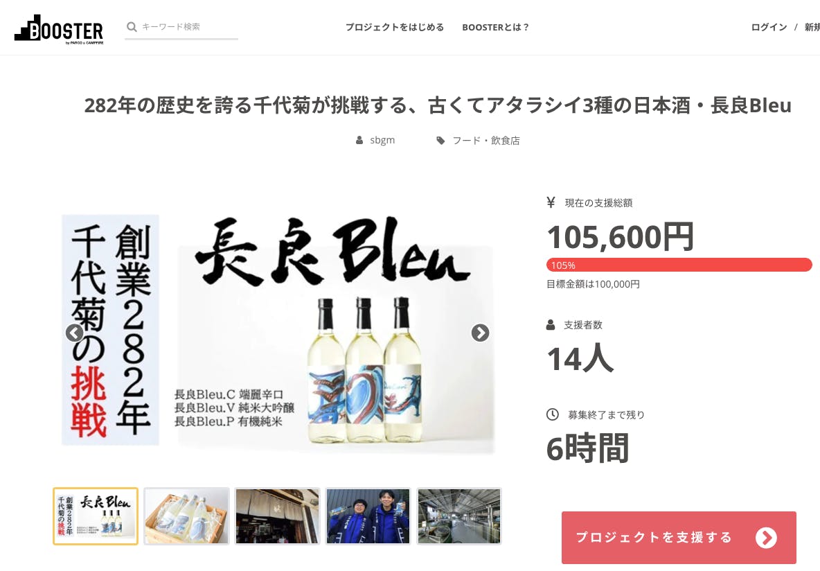 2021/03/30 17:33皆様この度は千代菊の挑戦『長良Bleu』のプロジェクトにご支援、ご興味をお持ち頂きまして、誠にありがとうございます!本日、最終日となりました!ひとりでも多くの皆様に千代菊の挑戦『長良Bleu』を知って頂き、応援購入を頂けた皆様に心より感謝申し上げます。引き続きより多くの方々に『長良Bleu』をお届けできように頑張りますので、SNSなどでの拡散にご協力を頂けますと幸いです。https://camp-fire.jp/projects/view/391023引き続き、宜しくお願い致します。『長良Bleu』プロモーションチーム一同 もっと見る