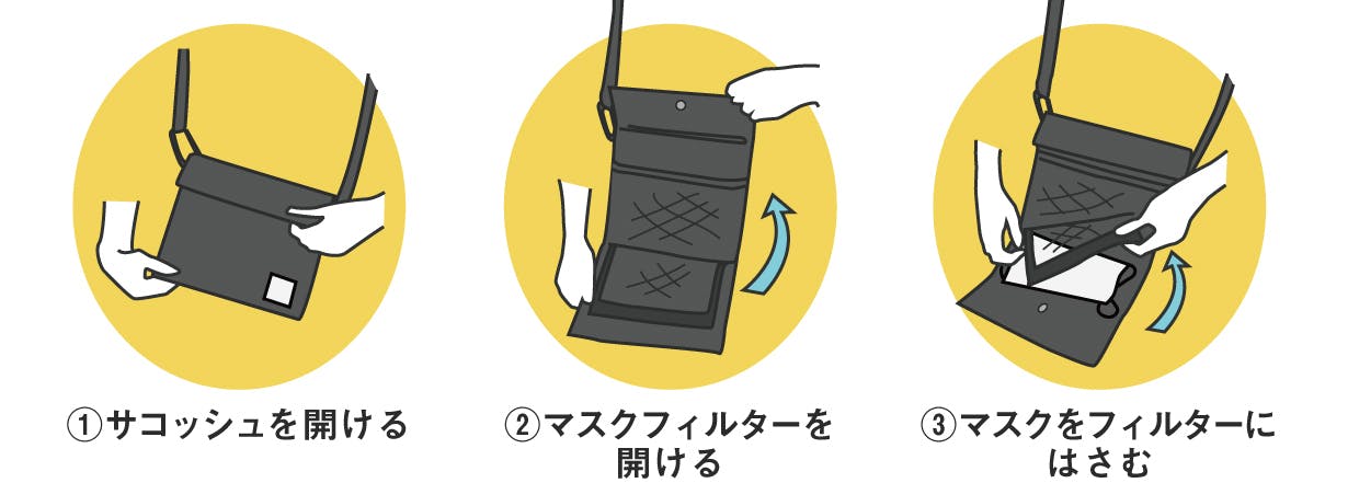 私たちはマスクを取り出したり、収納するまでの導線を常に意識し試作を繰り返してきました。試行錯誤の結果、いつでも簡単に出し入れでき、清潔に保管できるサコッシュの形状に辿りつきました。