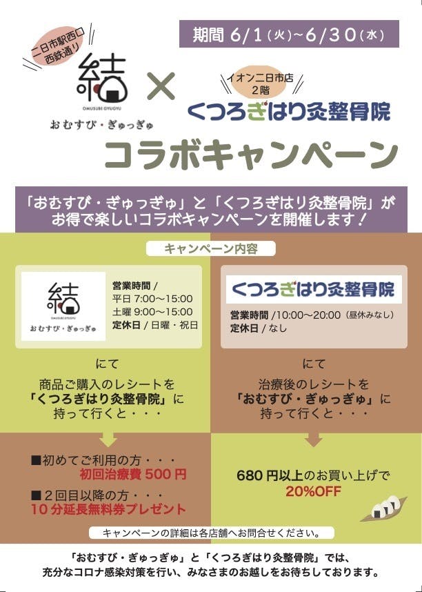 二日市イオンの2階にある、「くつろぎ整骨院」さんからお声かけ頂いて、くつろぎさんの