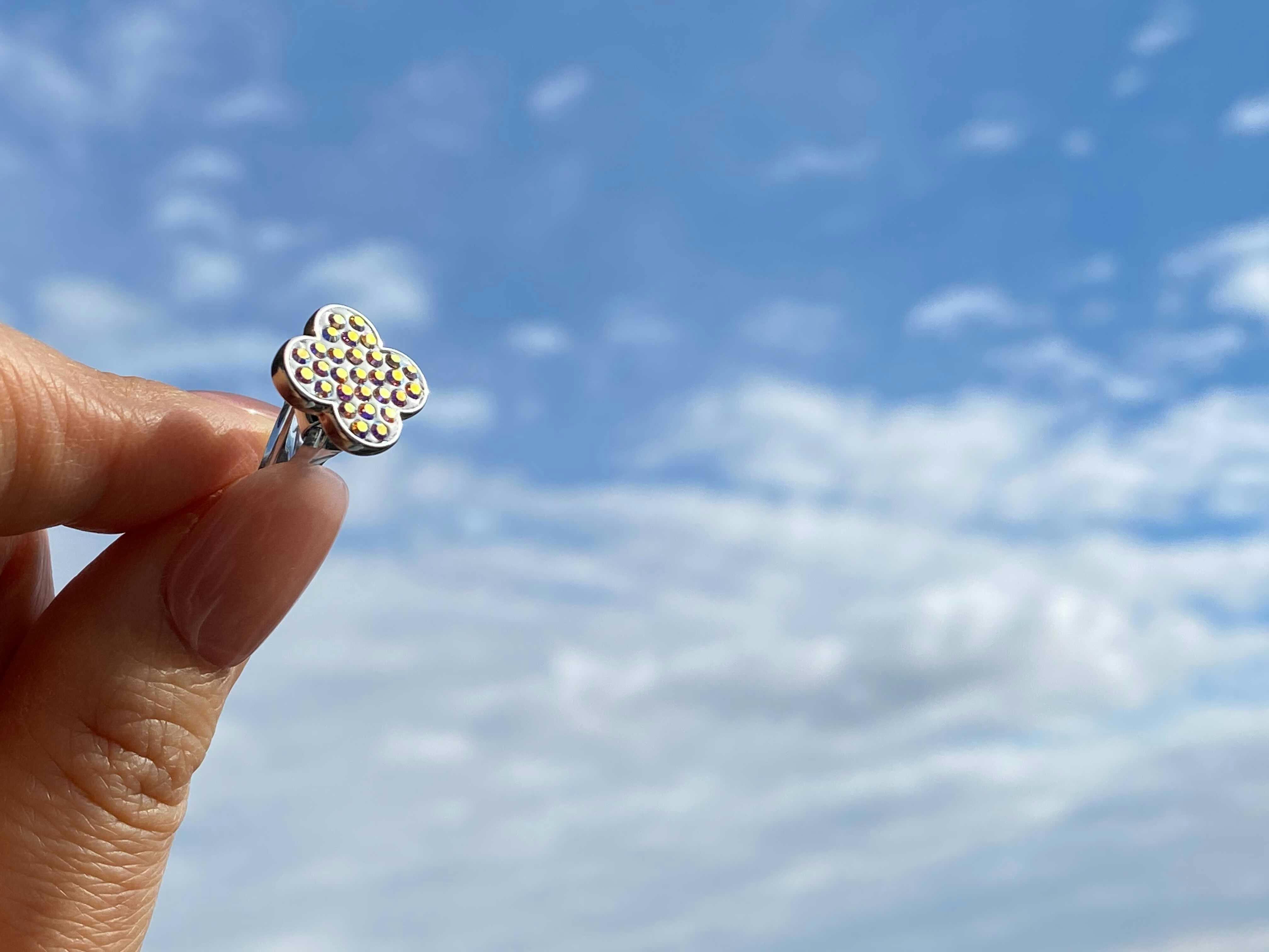 粘土状の接着剤にダイヤモンドカットのスワロフスキーⓇ・クリスタルを一粒ずつ埋め込み制作しています。