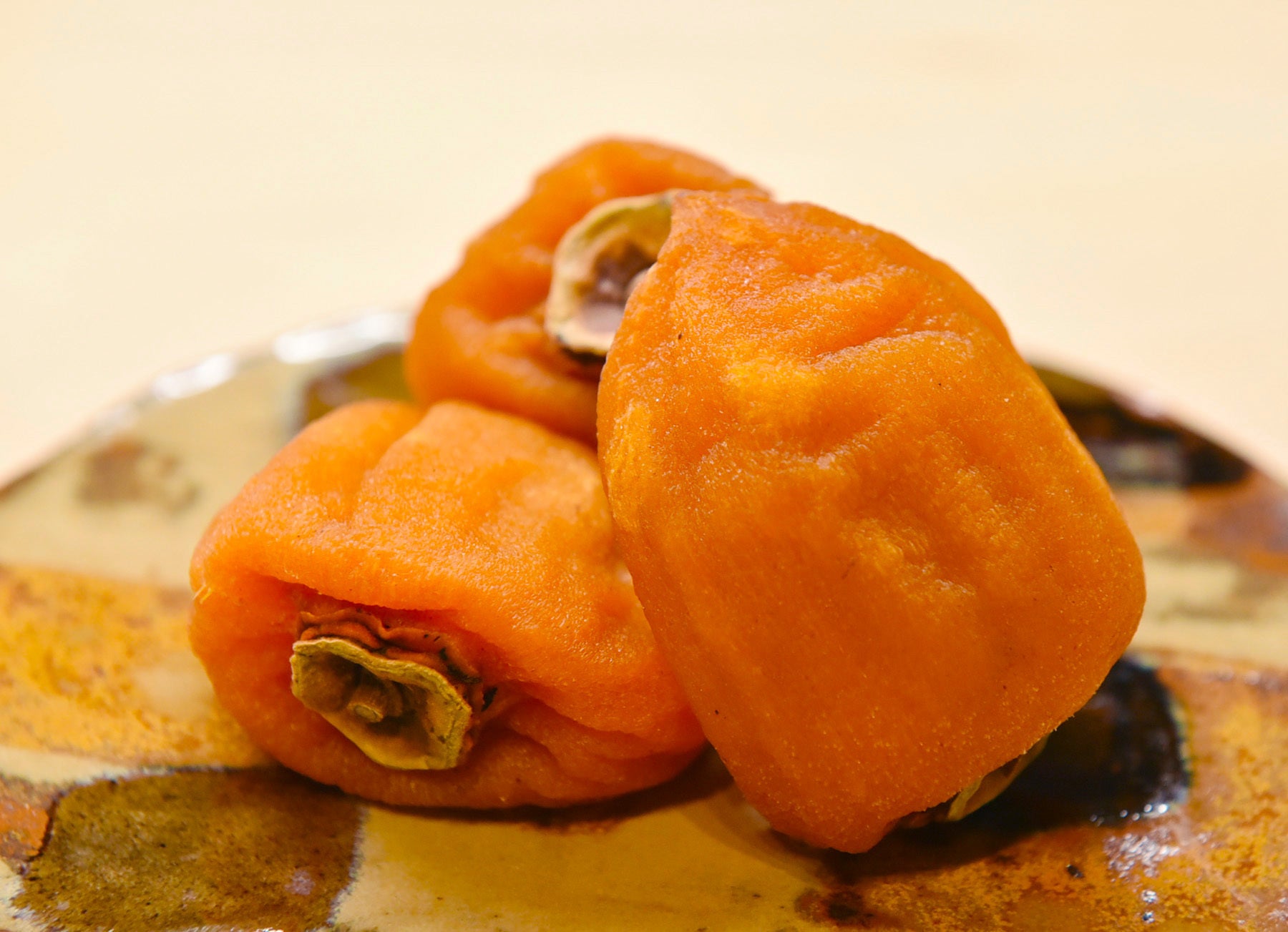 福島県伊達市梁川町五十沢の農家・曳地一夫さんの作る「あんぽ柿」です。あんぽ柿は五十沢の生まれの干し柿の一種です。製造過程で「硫黄燻蒸」することが特徴で、そのことにより通常の干し柿とは違うアメ色に輝く色になります。蜂屋柿という種を使うのも特徴で、とても大きい干し柿です。