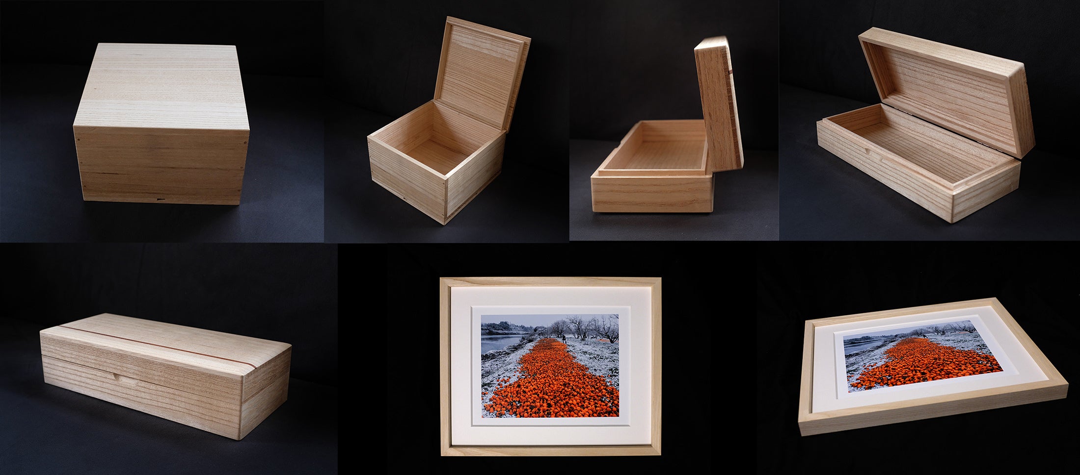 「会津桐タンス株式会社」さんの製品と、蓋部分の額のイメージ。これらの技術をもとに、写真集用の桐箱を特注で依頼します。