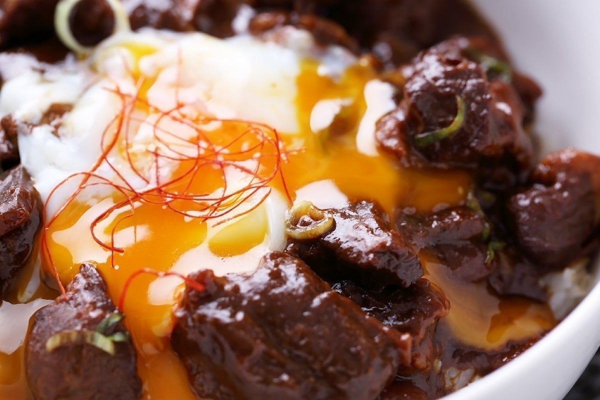当店の「どて味噌とろとろ牛めし」は、あえて定番のモツやスジを使わず、ごろごろの角切り牛肉をとろとろに煮込んだ新しいメニューです。