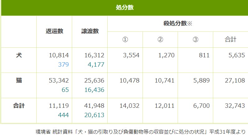環境省の統計データにもありますが、保健所に引き取られる内訳が上記表に出ています。