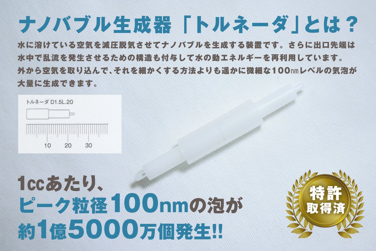 私自身、ナノバブル生成器「トルネーダ®」を使い始めたところ、様々な驚きの効果を実感、その技術に感銘いたしました。「水」だけで、汚れの洗浄ができる。
