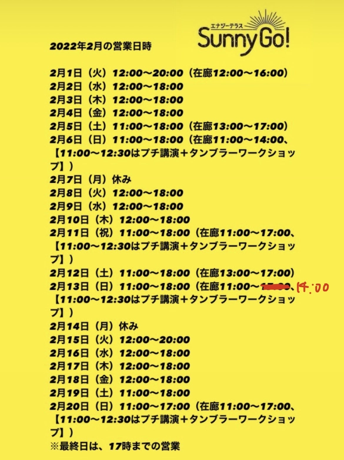 オープン時間、代表宮村の在廊時間は以下の通りです。