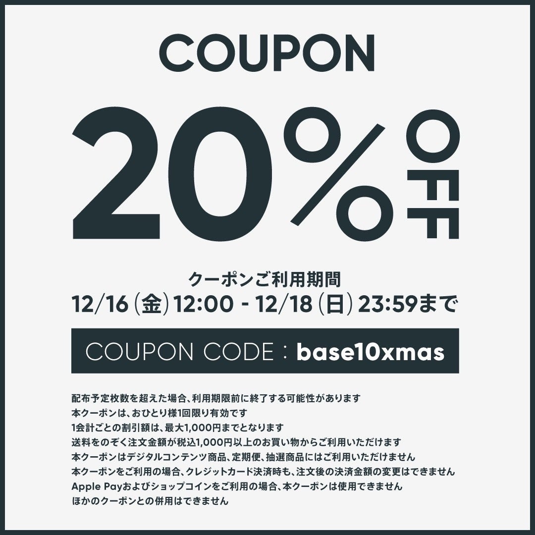 クーポンコード”base10xmas"を入力すると、SALE価格から更に20%オフになります。