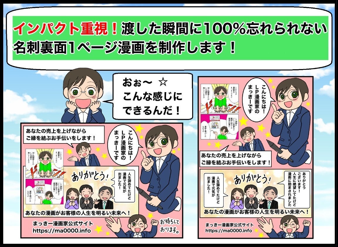 支援者の皆様、応援して下さっている皆様、通りすがりの皆様、いつもありがとうございます☆リターン追加いたしました!漫画家まっきーによる・インパクト重視!渡した瞬間に100%忘れられない名刺裏面1ページ漫画を制作!・QRコードからあなたが主人公の冒険の世界へお客様を楽しませながら、4ページ漫画で導きませんか?この2つを追加しました☆漫画で読者様のお仕事の売上を上げながら、素敵なご縁を結ぶお手伝いをしています(^^)LP漫画、アイコン用イラスト、You Tube広告のカット漫画などのクリエイターや記事添削、ストーリー添削なども活躍中です☆よろしくお願い致します!漫画家まっきー公式サイトはこちら↓https://ma0000.info
