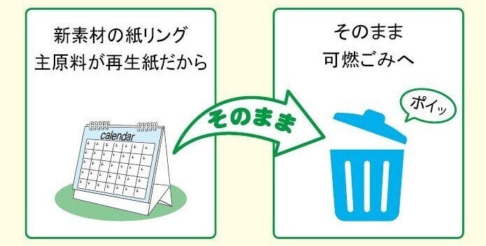 リングにもこだわりました。多くの卓上カレンダーは、金属のリングやプラスチックのケースを使っています。処分するときには、必ずばらす手間がかかります。『ご当地カレンダー』は、カレンダーのリングにECO 紙プラリングを採用していますので、ばらすことなくそのまま可燃ごみとして処分が可能です。