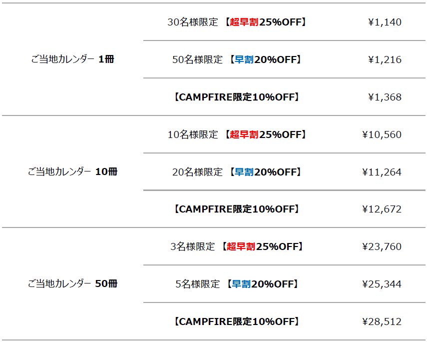 もし上記以上のご支援をいただいた時には、『ご当地カレンダー』を広める広告宣伝費に使わせていただきます。