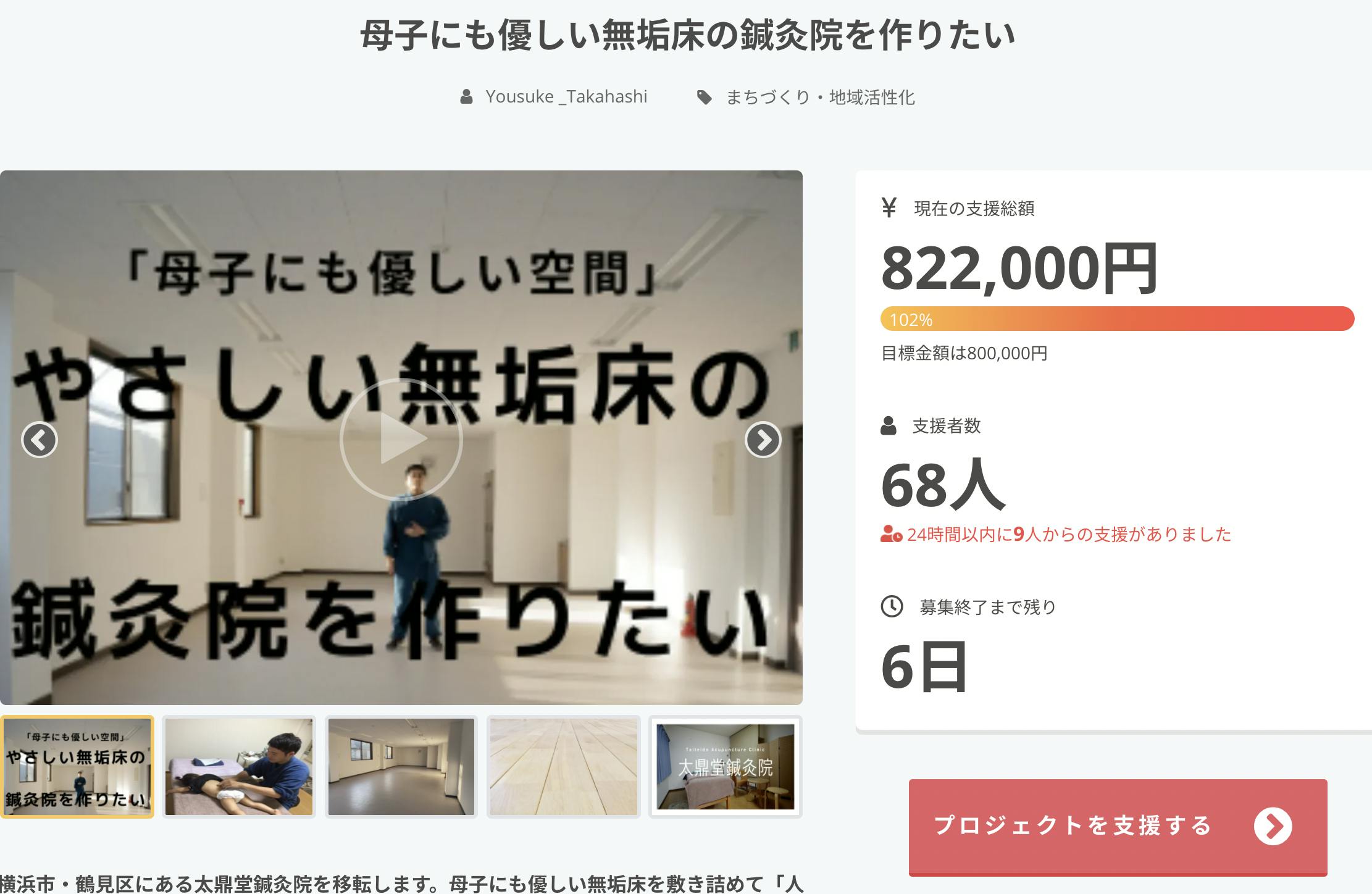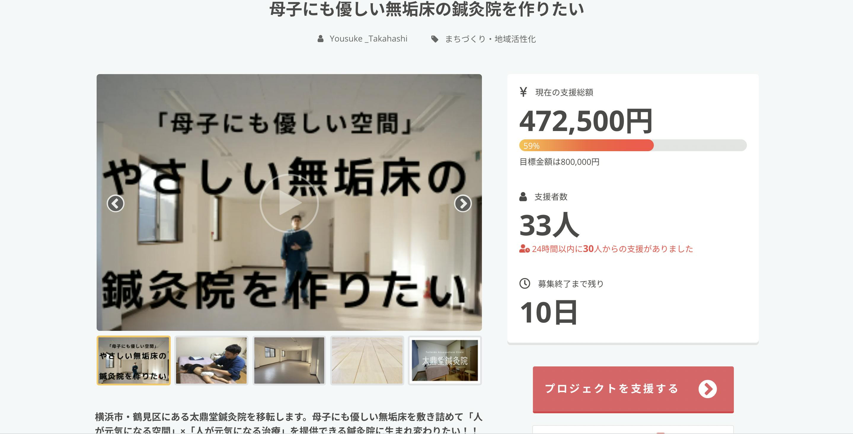 2021/05/24 09:44ご覧くださいり、ありがとうございます!!タイトルにもありますが、なんと100%を達成しました!!公開からわずか、4日半での出来事です(スタッフ一同驚いております。)こんな閉塞感ばかりの社会ですから、そんな中で「元気な人が増えてほしい!」という「思い」の数が多いのだと感じています!僕らは、ワクチンの注射も打てませんし、政治を行ったりもできません。アスリートのようにオリンピックには出られませんし、有名人の方のように日々人を勇気づけたりすることも難しいです。けれど、目の前の人を元気にすることはできます。そんな 僕らの背中を後押ししてくださった方々はそんな僕らの元気にする力に望みを託してくれたのかなと思います。残り、まだ6日間あります。この先は、さらに良い空間に向けて挑戦を続けていきます。こんな大勢の方から背中を押される挑戦は気合が入ります。僕らは、この世の中の問題を解決するような力はないかもしれないけれどみなさんが託してくれた思いを胸に、全力で人を元気にしていきます。本当にありがとうございました。そんな中で考えていたのですが出来れば、実際に元気にする人に向けた活動を始めたいですコロナ禍で大変な状況になっている方や子どもを元気に出来ればと考えてます。ただいま、申請中なのですが「1人親の方に治療チケットをプレゼント」というリターンを出そうと考えています。日本には母子家庭の家庭数は123万世帯になるそうです。父子家庭は18万世帯。平均年収は、母子家庭で243万円、父子家庭で420万円とかなり開きがあるんですね。社会的や家庭的な事情から、自分のケアをする間もないまま日々、懸命に育児と仕事をされている(主に)お母さんがいらっしゃいます。昨年、コロナ禍で自分にも子どもが生まれたのですが、子育ては24時間休みがなくしかも10年以上も続ける必要があります。特に最初の5年ほどは、不意な怪我の対策や、すぐに体調不良を起こす子どもの看病など、ご近所トラブル、しつけ、教育や役所への申請や小児のワクチン接種のための通院など驚くほどに時間が取られていきます。その上で、安定したお給料のためにも働き続けなければなりません。今まで10年以上臨床で向き合ってきましたがそういった家庭のお母さんは、体がボロボロです。「これがいつもの体ですよ、なんてことないです」なんて言われると涙が出そうになる程感激します。自分の事を顧みずに、本気で生きてこられたんだなと誰かのために、懸命に毎日必死だったんだろうなと感じるんです。男性とは違い、女性は更年期や月経など、日常的な体調の管理が難しいタイミングもあります。体調管理がとても難しいんです。「子どもは社会の宝」と言われます。これからは、子育てはお母さんが頑張ればいい。という物ではなくて「助け合う」が大切なんだと思います。僕はお乳も出ませんし、母性もありませんから、どう頑張っても逆立してもお母さんには敵わないんですね。でも、お母さんを元気にすることはできる。体調管理をして、子どもにもっと優しい温かいお母さんを会わせてあげることができる。幸せな親子の時間を作ってあげられるかもしれないんです。ただ、そんなお母さんたちは自分に時間やお金を使う余裕がない事もあるんです。今回皆さんからいただいた「元気な人が増えてほしい!」という思いを、「1人親家庭」の方にも受け取ってほしいと思います。今、CAMPFIREさんがとても忙しくてリターンの申請に時間がかかっているのですが、もし間に合えばご覧くだされば嬉しいです。これは、僕のワガママです。身勝手な事を言っている事もよくわかっています。達成した感謝と同時に、さらにお願いをするなんて野暮ですし不躾だともわかっています。だけれども、どうかお願いします。今は力を貸してください。僕らの日本を元気にする!という活動で必ず返します。ここまでご覧くださりありがとうございました。そして、ご支援本当にありがとうございます。心から感謝いたします。太鼎堂鍼灸院 院長 髙橋洋輔 もっと見る