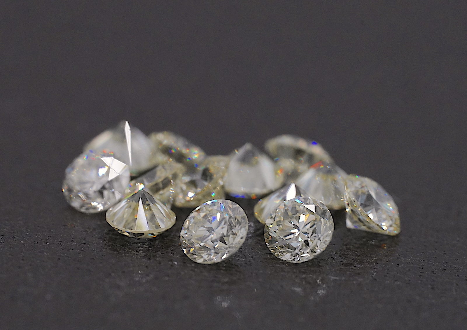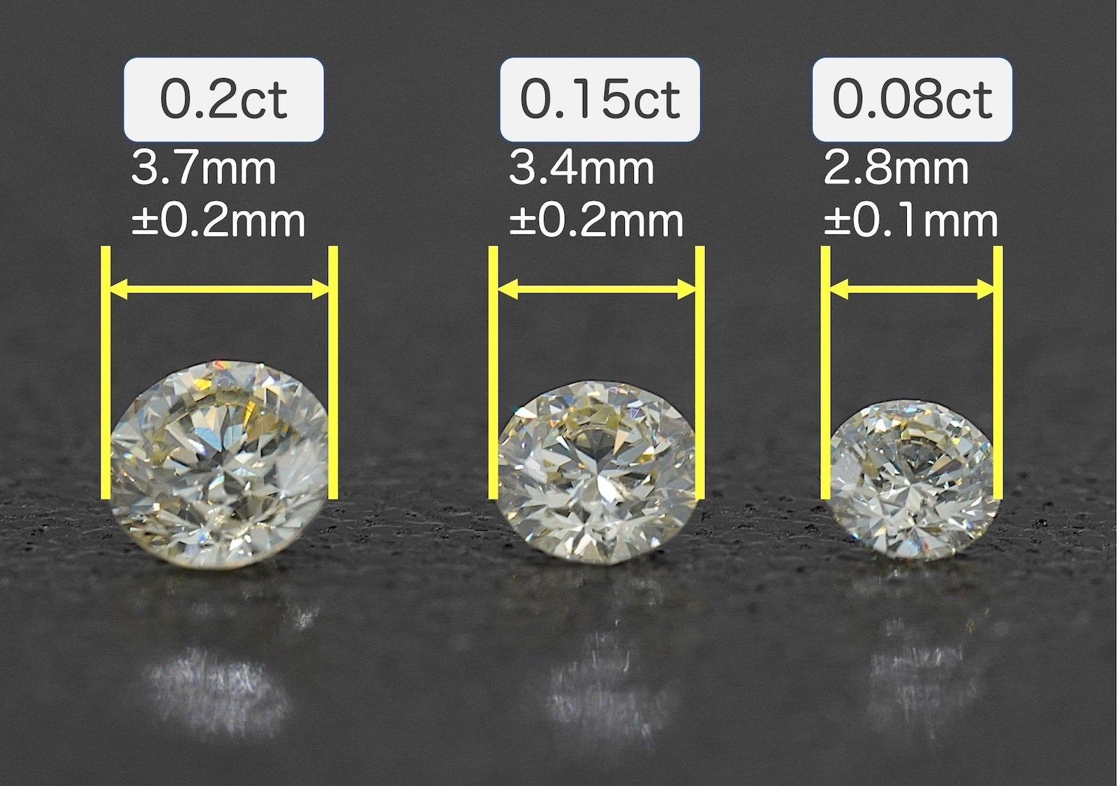ラウンドブリリアントカットなので、直径と高さが一粒一粒若干異なります。ダイヤモンド自体の重さは0.08ctで統一していますのでご安心下さい。