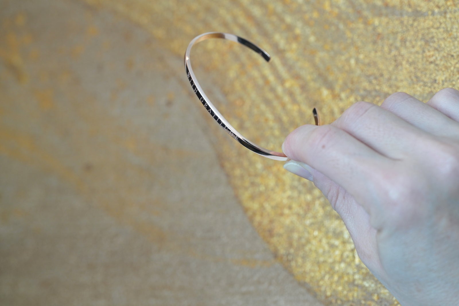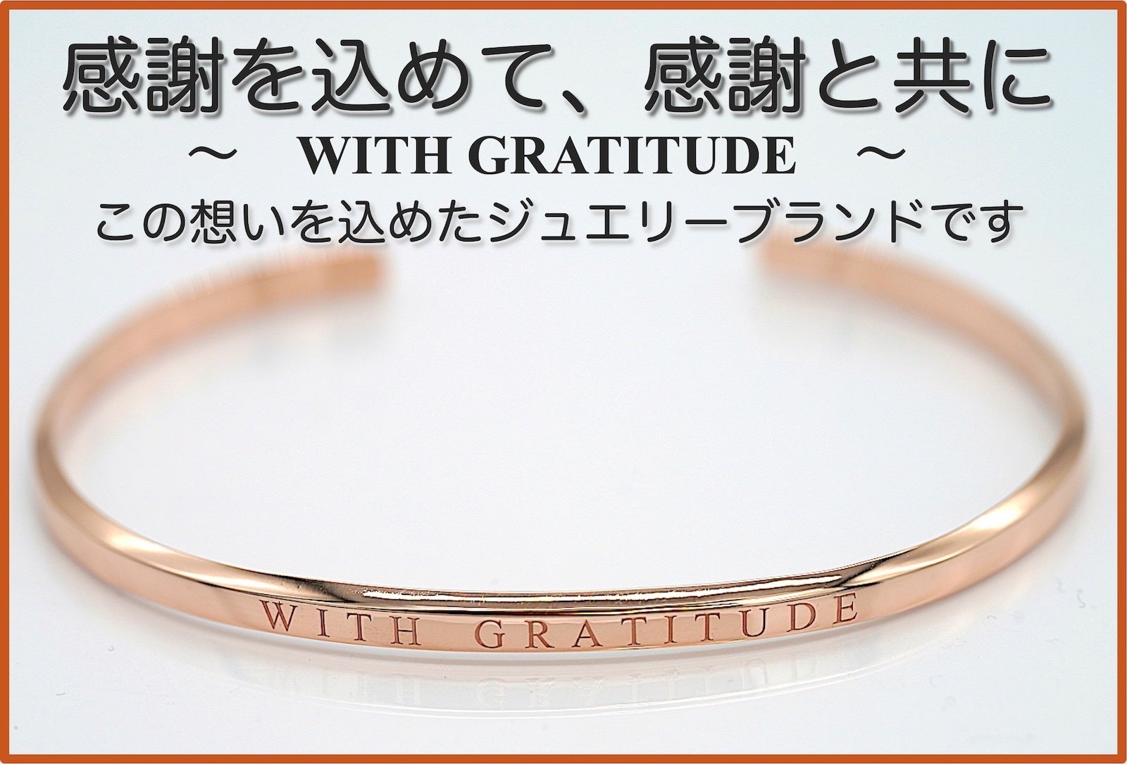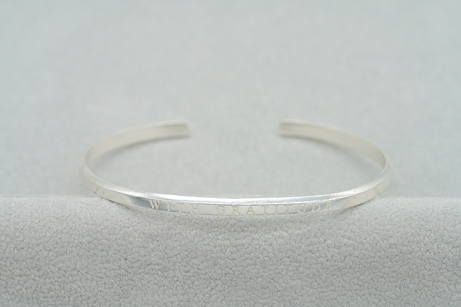 バングルの表面には「WITH GRATITUDE」の文字が入り、フォント自体も美しいデザインになるように選び、文字の間隔にもこだわっています。