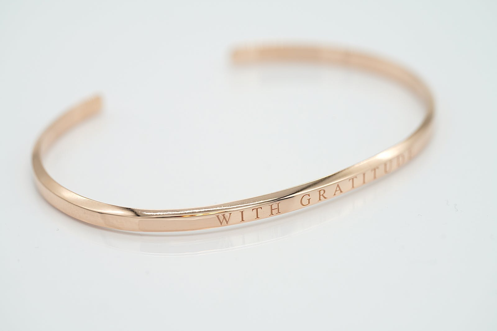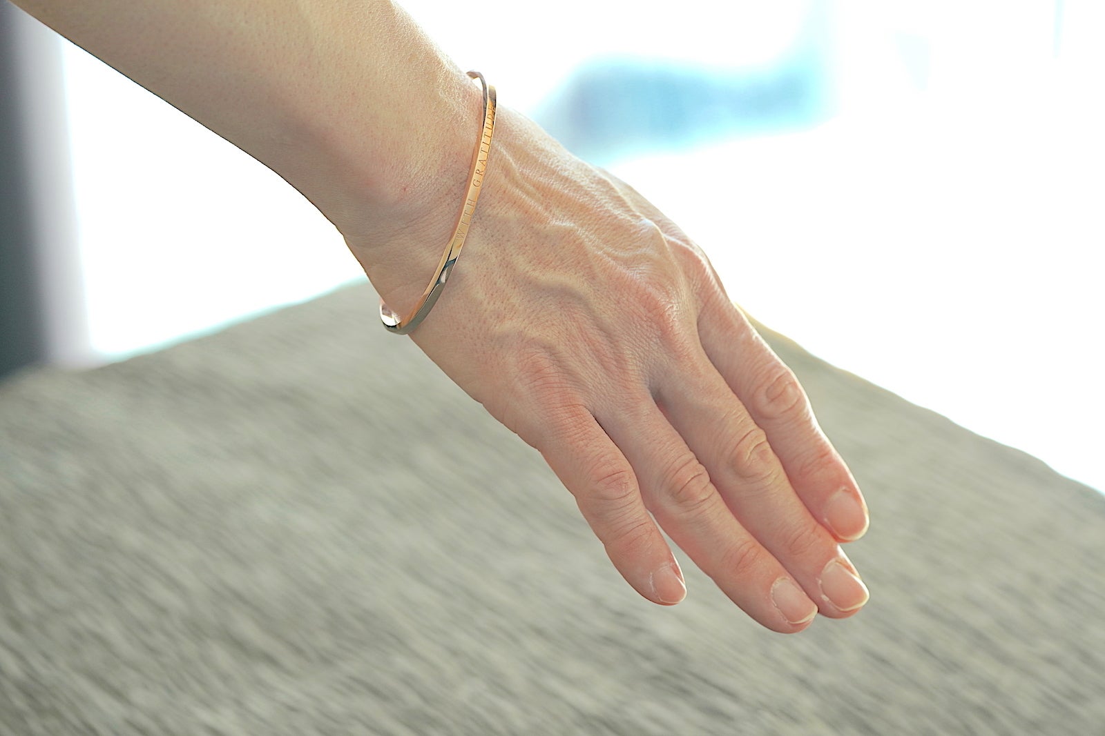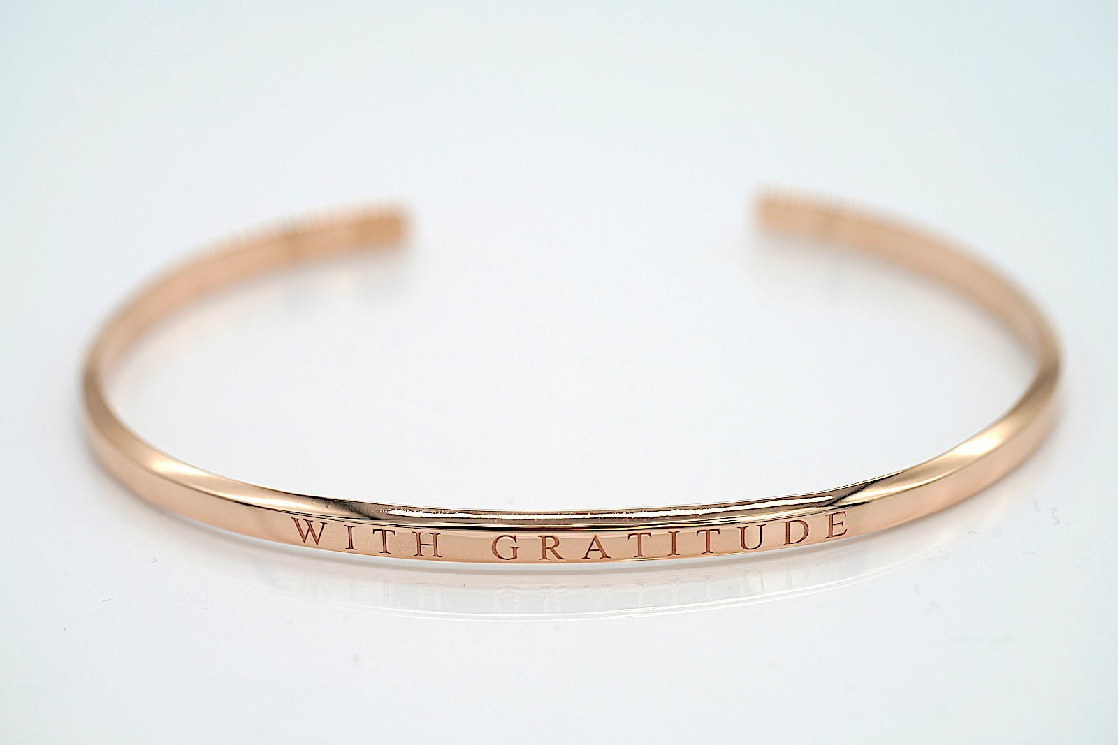バングルの表面には「WITH GRATITUDE」の文字が入り、フォント自体も美しいデザインになるように選び、文字の間隔にもこだわっています。