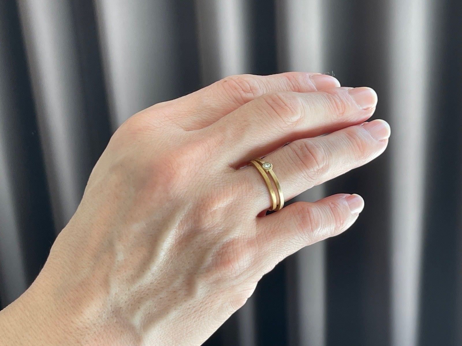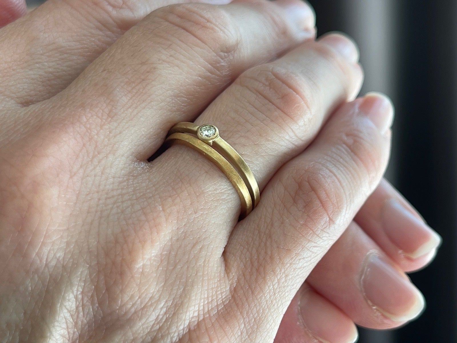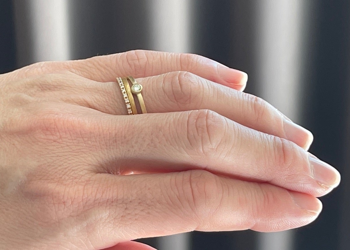 重ね付け用には細身でとにかくシンプル、リングだけでもきれいで、重ね付けしたときは主張しないようなデザインがベスト。