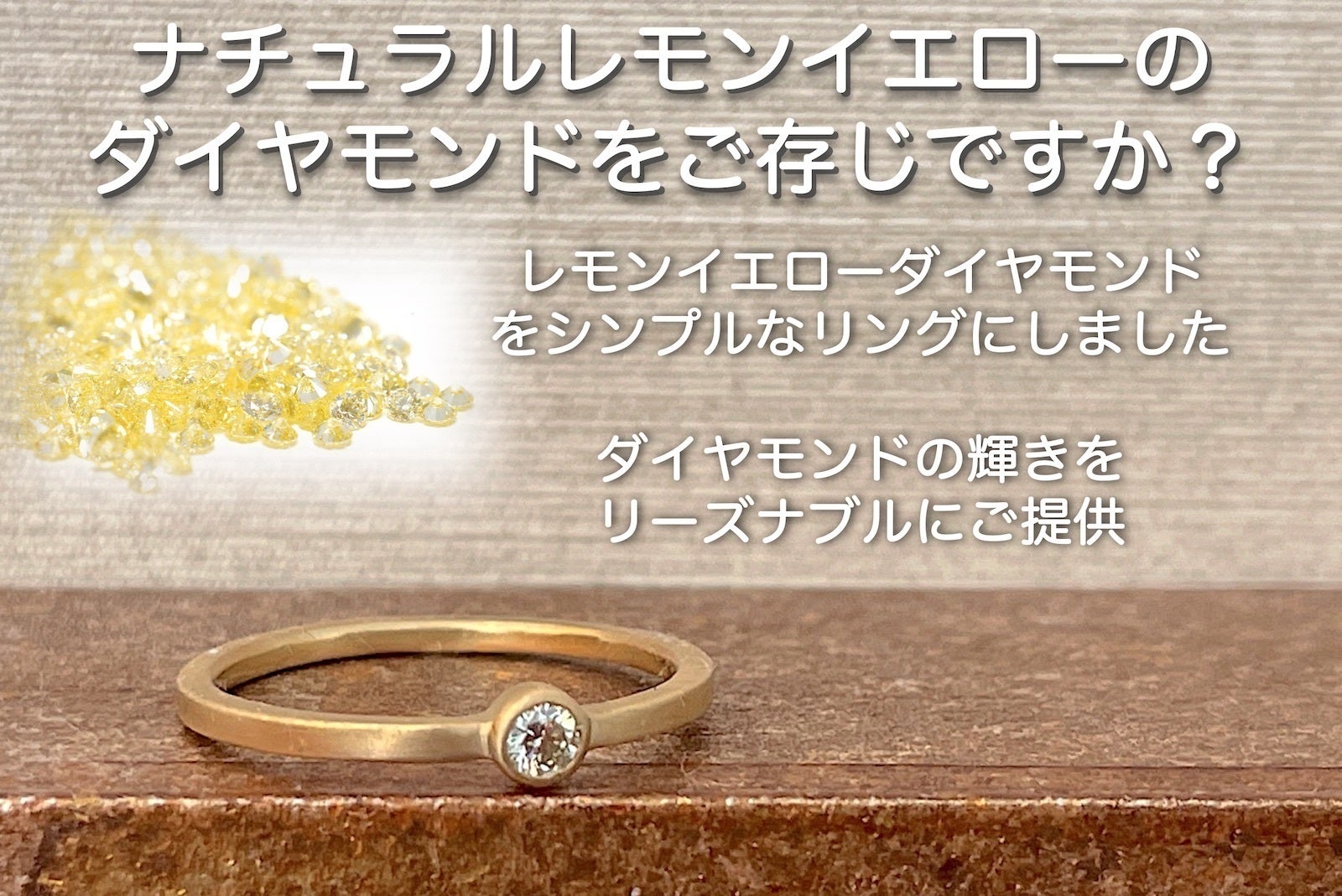 とてもシンプルなダイヤモンドリングです。今回奇蹟の出会いとなった天然のナチュラルレモンイエローダイヤモンドは透明感がたっぷり。そのダイヤモンドはatelier-namiがひとつひとつルーペで確認、厳選しました。太陽光のもとではもちろん、室内の白熱光でもきらきらと輝きます。
