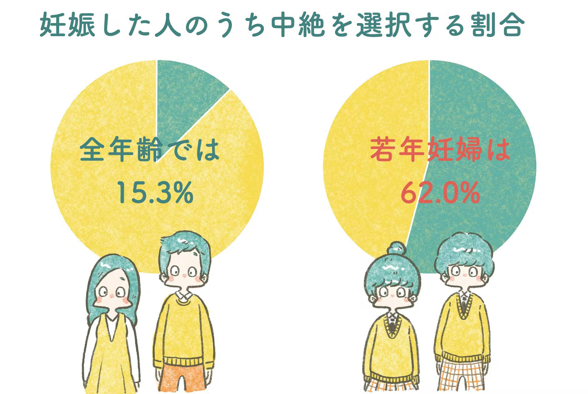 ほかの世代では全体の妊娠のうち15%が中絶を選択するのに対して、10代が妊娠した時の中絶率は62%と約4倍。緊急避妊薬の値段の高さが、中絶率を高める要因の1つであると考えられます。