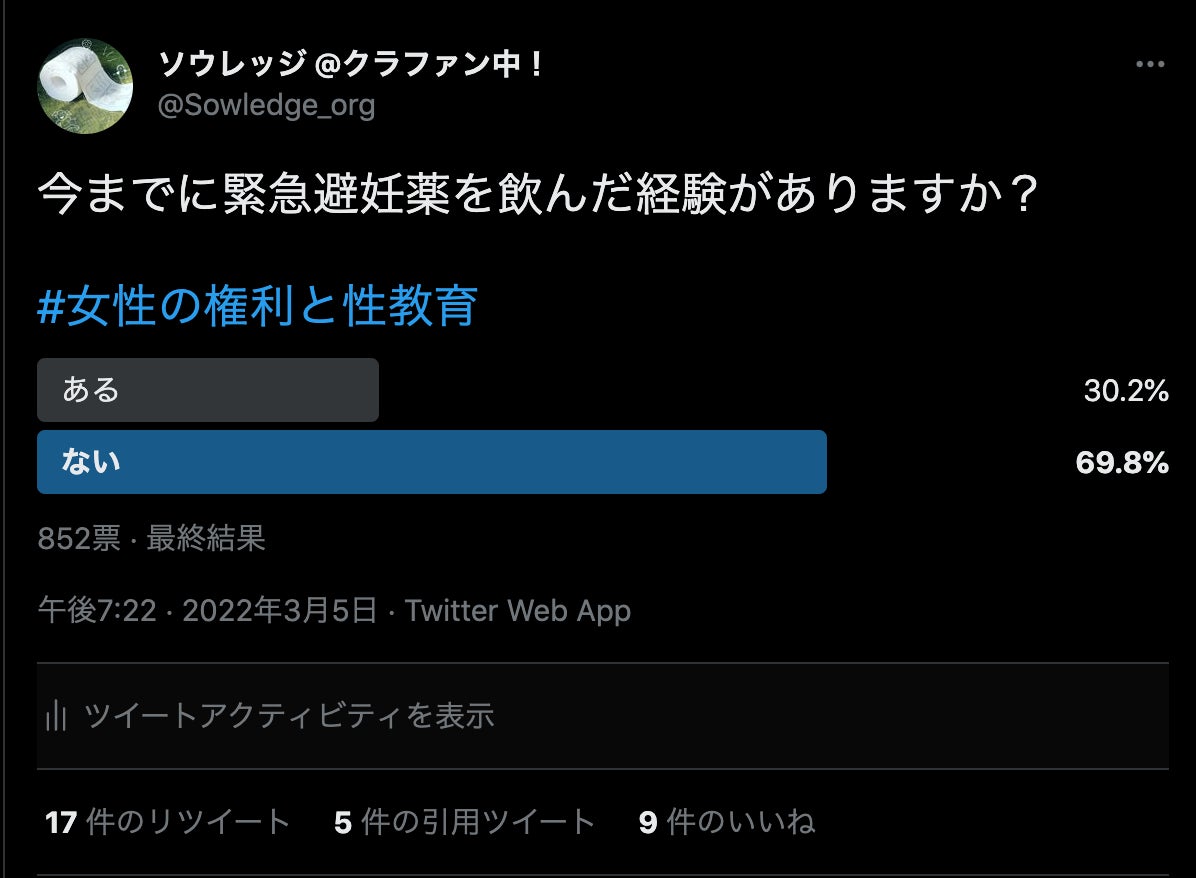 最後にもう一度、現在クラウドファンディングに挑戦中です。ぜひ参加していただけたら嬉しいですし、あと話してもらうのが何より嬉しいです。特に男性は、緊急避妊薬のクラファンに参加することよりも、話すことの方がハードルが高いなと最近感じています。ソウレッジのメンバーで、友達にこのクラファンのお知らせを送っていると、「実は彼女に飲んでもらったことがあって」みたいな人が結構いるんです。だから、課題は意外と身近にあるんだなと。「実はこういう経験があって」みたいなお話をするきっかけになるかなと思っているので、ぜひいろんな形で関わっていただけたら嬉しいです。お願いします。