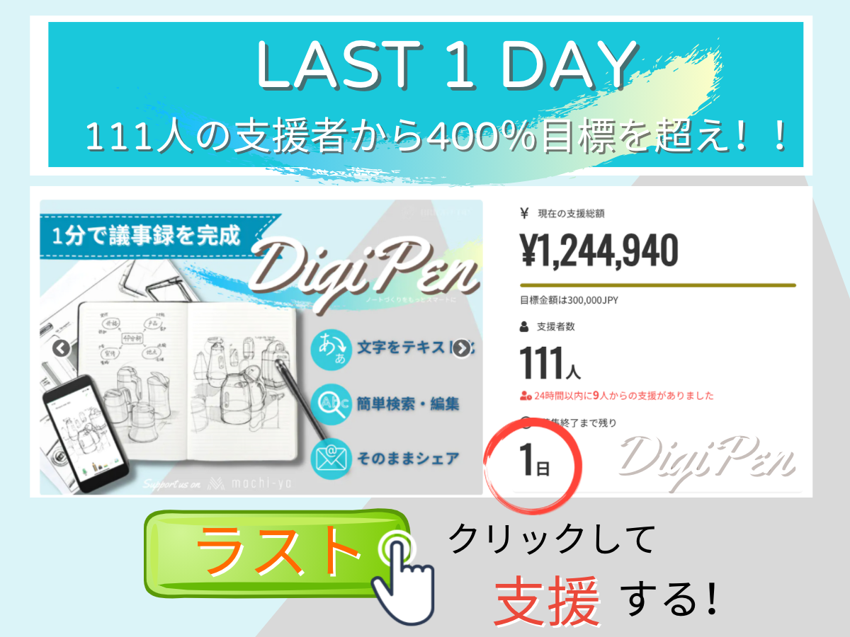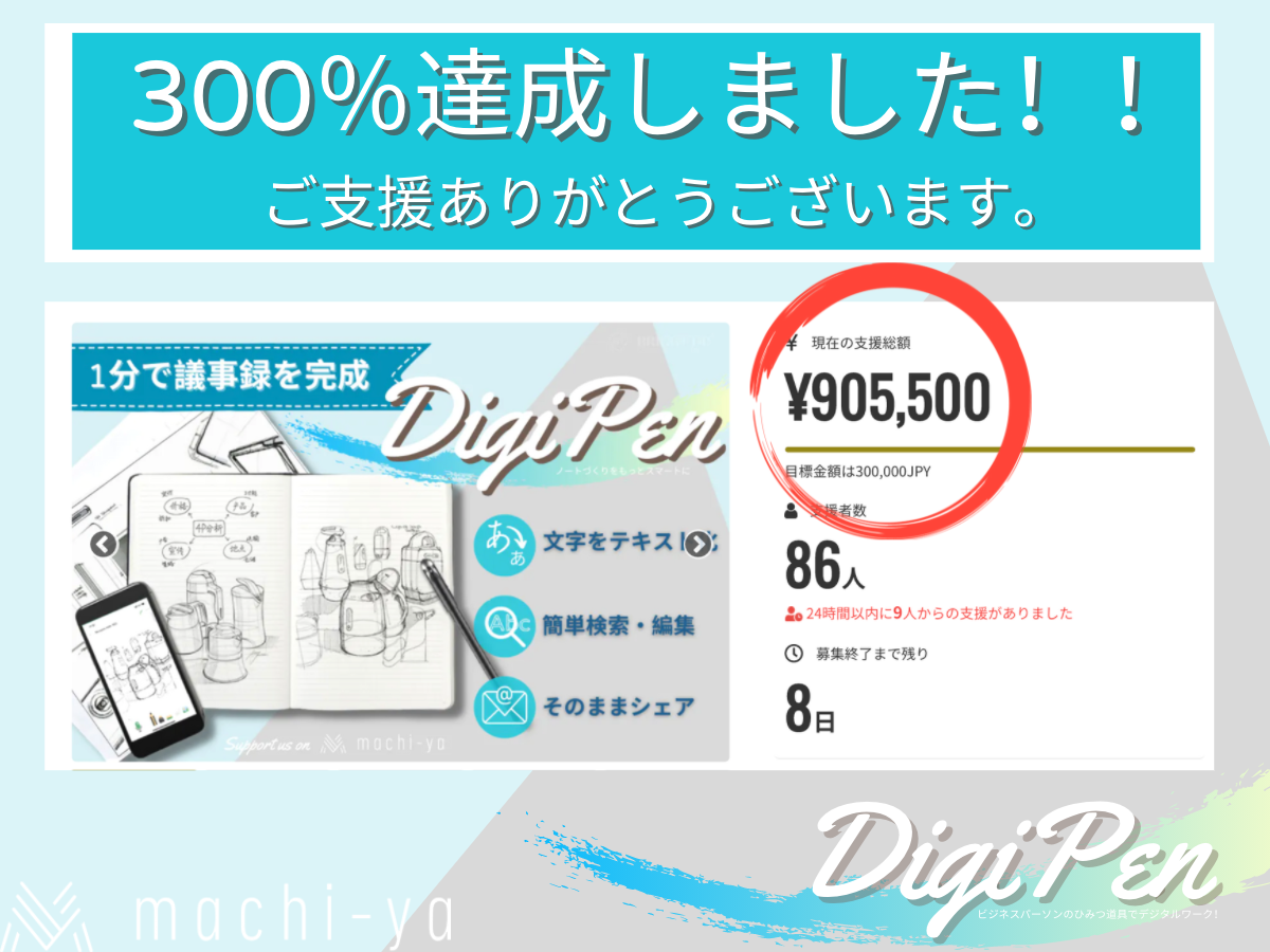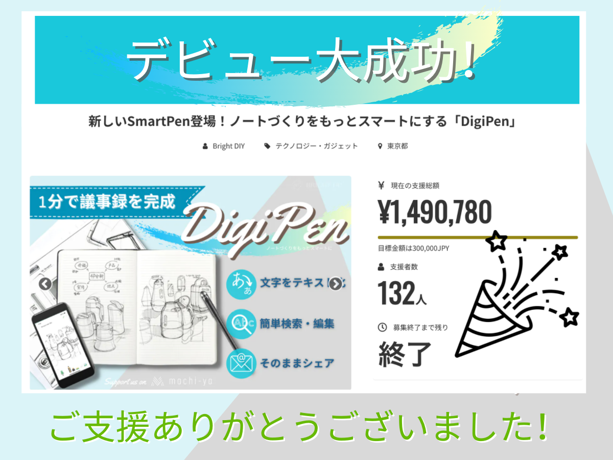 支援者の皆様、今回、多くの支援を頂き、「SmartPen登場!ノートづくりをもっとスマートにするDigiPen」のデビュープロジェクトが無事に終了しました。誠にありがとうございました。皆さんのおかげさまで、これからもIoTやスマート製品の開発を計画し続けることができるようになりました!支援総額:1.490.780 円支援者数:132 人※詳細はこちらからご覧いただけます。https://camp-fire.jp/projects/view/392099リターン準備の方はキャンペーン中の報告通りに進行しています。ご参考までに以下のスケジュールをご覧ください。プロジェクトの意義① コロナ禍の時期で仕事効率化に役立つ電子文房具を普及させたい。 議事録を2〜3時間で打ち直す業務は誰でも経験したことがあると思います。非常にもったない時間だと思います。コロナ禍で様々な変化が訪れ、働き方の向上にも貢献したいと思い即座に議事録化等の機能を加えました。 ② クリエイティブな仕事や「紙」に書かなければならない仕事に対し、「紙」への書き味を大切にしながら、テレワーク時代に役立つ電子文具を普及させたい。私達はパソコンを使い、最新の商品を開発していますが、「紙」に書かなければ仕事はまだまだ存在します。やはり、パソコンやタブレットの書き心地と「紙」の書き心地は全く異なります。「紙」の書き味を大事にしたいと思い、本プロジェクトを立ち上げました。③ 一部の資金調達は日本市場に合わせ、更に効率の良い機能をアプリやノートに導入します。 商品を販売のみならず、更に良い商品をみんなに届けたいので、本プロジェクト通じて、支援者様のリクエストに対し、アプリ改善やノートのデザインの改善を考えております。一生の商品として使ってもらいたいので、更に良い商品ができるように全力努めたいと思います。 本プロジェクトが終了した後、アンケート調査しますので、是非ご協力ください。追加の機能の導入やより良い商品を開発いたします。④ 本プロジェクトの実績に基づき、ハイクオリティの日本製のノートが生産できるように努め、国内のメーカーをサポートします。本プロジェクトの実績通じて、今後日本でノートを生産できるように企画しております。和紙にこだわる方は是非本プロジェクトにご支援ください。支援状況や一般販売の状況に応じて、専用ノートを国内メーカーに依頼を検討しています。これからもご支援ください!何卒宜しくお願いいたします。BRIGHT DIY チーム